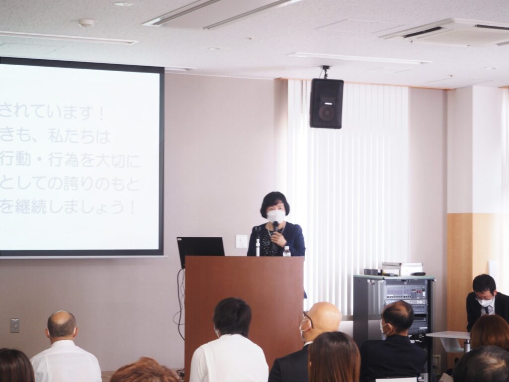 式典では冒頭、小松理事長が創立44周年をともに祝いましょうと呼び掛け、「どのようなときも、私たちは倫理綱領に準じた行動を大切に法人育成会の職員としての誇りのもと利用者の支援を継続しましょう」と挨拶を行った。その後、永年勤続者の表彰に移り、参加した職員、リサイクル工房従業員の9人に小松理事長から賞状と記念品が手渡された。また、永年勤続者を代表し鈴木克之事業所長(八幡西障害者地域活動センター)が「私たち36名が今日まで無事に勤めることができたのも、上司、同僚、後輩の皆様方のお力添えがあればこそと、感じています。個人としては、育成会の成長の変遷を体感しながらの40年で、充実した年月であったと感じでいます。今後も本日の栄誉に報いるためにたゆまぬ努力をいたす所存です」と40年を振り返り、今後の抱負を述べた。なお、今年度の永年勤続対象者は職員、リサイクル工房従業員の36人で、会場に参加していない10年、20年、30年勤続者については名前が紹介された。後半は人権研修が行われ、法人の虐待防止委員会の委員長である北九州市立大学地域創生学群の坂本毅啓(さかもと たけはる)准教授が「マネジメントとコミュニケーション技術から考える~利用者本位で風通しの良い組織を目指す~」をテーマに研修を行った。研修では、利用者の生活と福祉に関わる現場を預かる者として、これからどのような組織づくりを目指していけば良いのかについて参加者で検討が行われた。このなかで具体的な職場での例を上げ、4、5人でグループワークを行い、うまくいくコミュニケーションのポイントや聞き上手になるコミュニケーション技術、マネジメントについて学んだ。最後に坂本准教授は、「改めて『我々福祉職は、誰のため、何のために仕事をしているのか』という基本に立ち返ることが大事である」と述べた。なお、同研修は録画されており、各施設・事業所で伝達研修を行うこととなっている。
