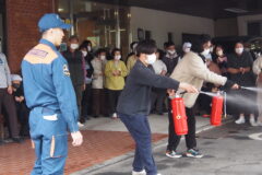 4月1 5日(水)消防立ち合いの火災想定避難訓練を行った後で消火訓練を行いました。「火事だ~」と大きな声で叫びながら、「ピノキオ」の合言葉通りに放水しました。(ピ:ピンを外す ノ:ノズルを握る キ:気…