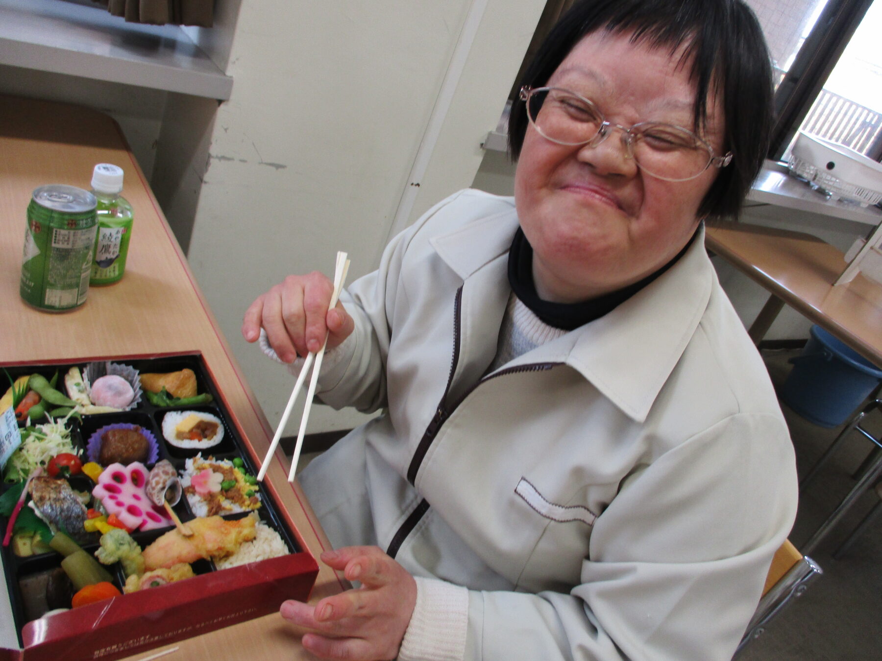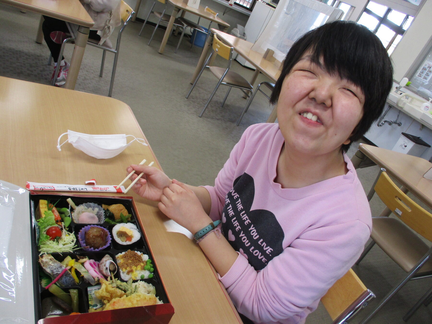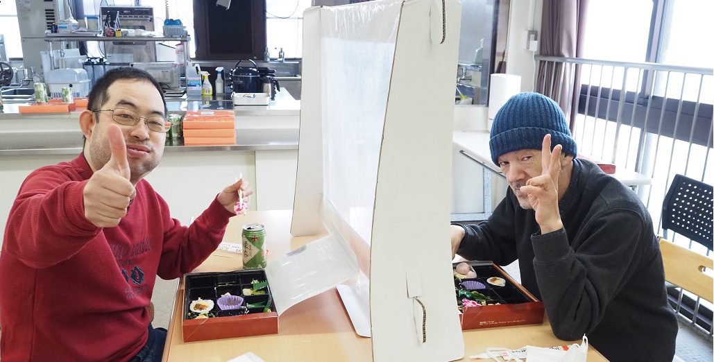 洞海工芸舎では、今年度最後のさくら会を行いました。今回のさくら会の昼食は豪華なお弁当。いつもと違うお弁当箱に興味津々!いざフタを開けるとあざやかな料理にキラキラと目を輝かせていました。あっという間にお弁当箱を空にする利用者さんや、じっくり味わっている利用者さん、みなさんそれぞれ笑顔がいっぱいでした。