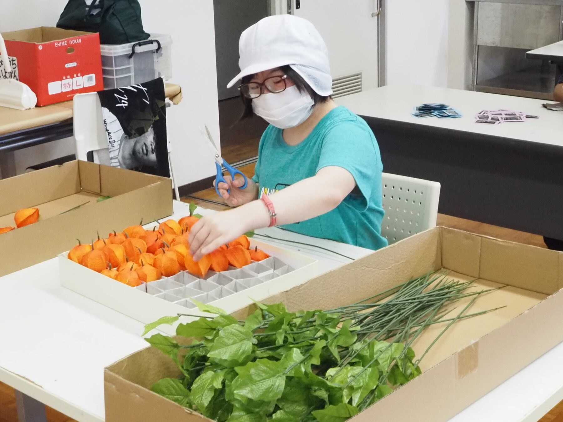 毎年夏になると、施設外就労先のマルキタ流通さんから届いたホオズキの造花の切り取り作業を行います。ここで作られたホオズキは、お盆のお供え物の飾りなどに使われます。季節を感じるこの作業を楽しみに待っている利用者さんも多く、皆さんとても熱心に取り組まれています!(中武)