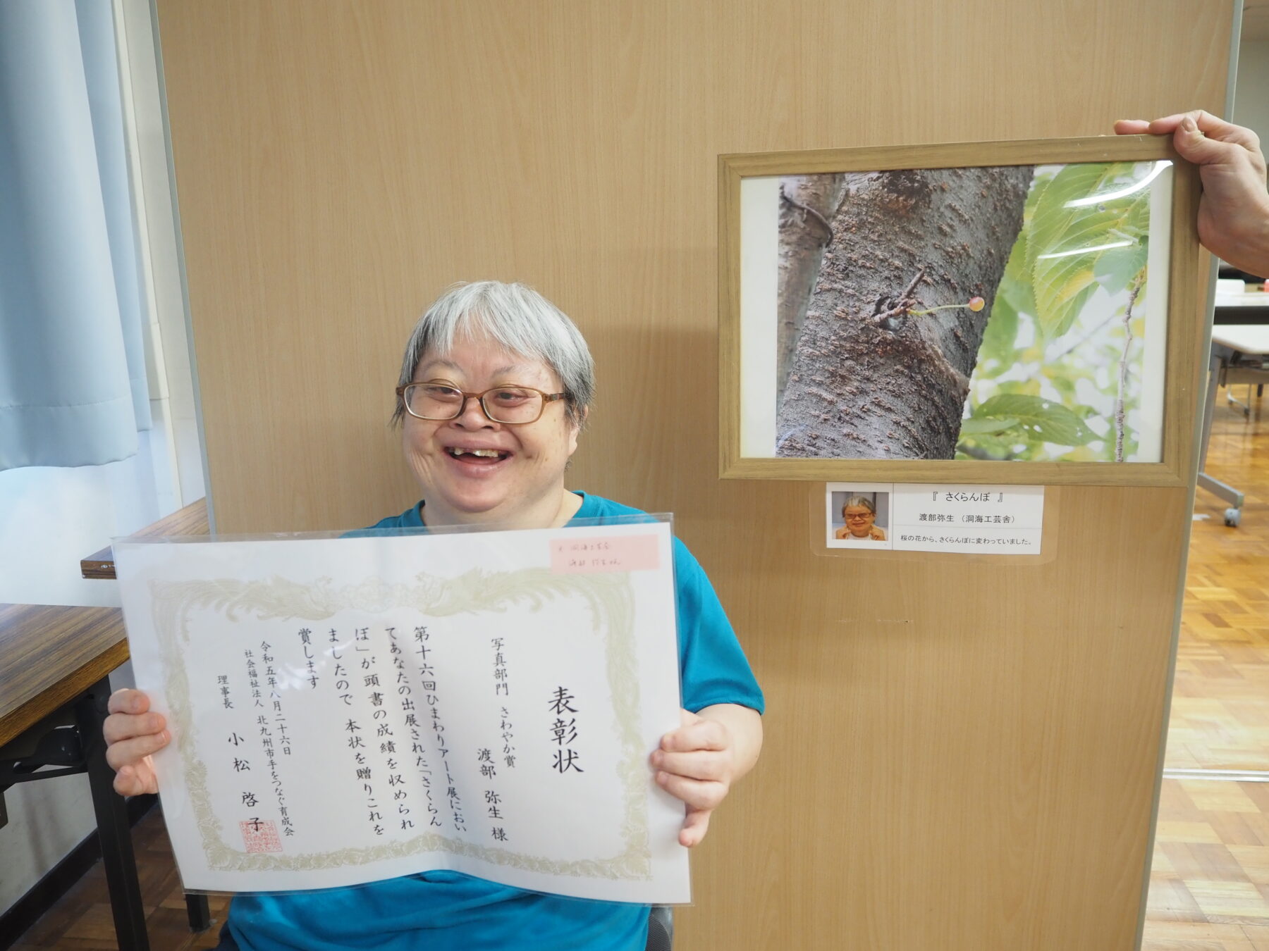 「やったよ!さわやか賞とったよ!」と笑顔で報告してくれたのは、生活介護のメンバーの渡部弥生さん。ひまわりアート展に写真部門で応募する為、6月の梅雨の合間、近くの高塔山に撮影に行きました。最初は「どこ押せばいい?」「難しいねえ」とむずかしい顔をしていましたが、慣れてくると「あれも撮りたい!」「綺麗な色だから撮っておこう!」などと、楽しんでいました。今回ひまわりアート展で受賞した感想を聞くと、「また今度も写真で応募したい!ホントに嬉しいです」と満面の笑みで答えてくれました。(濱口)