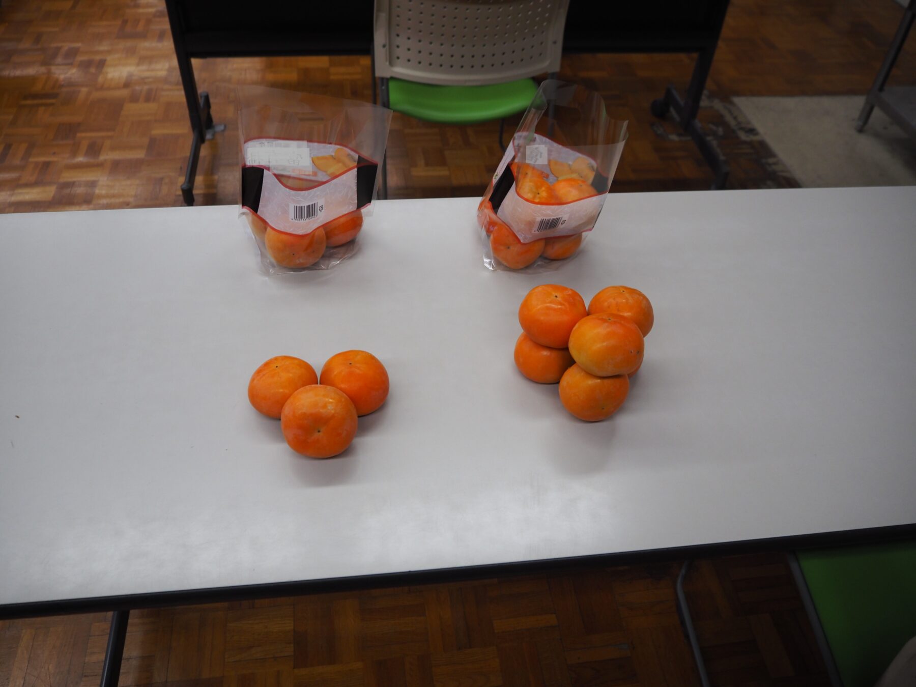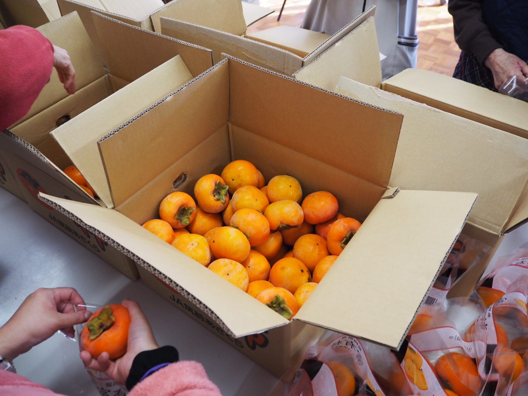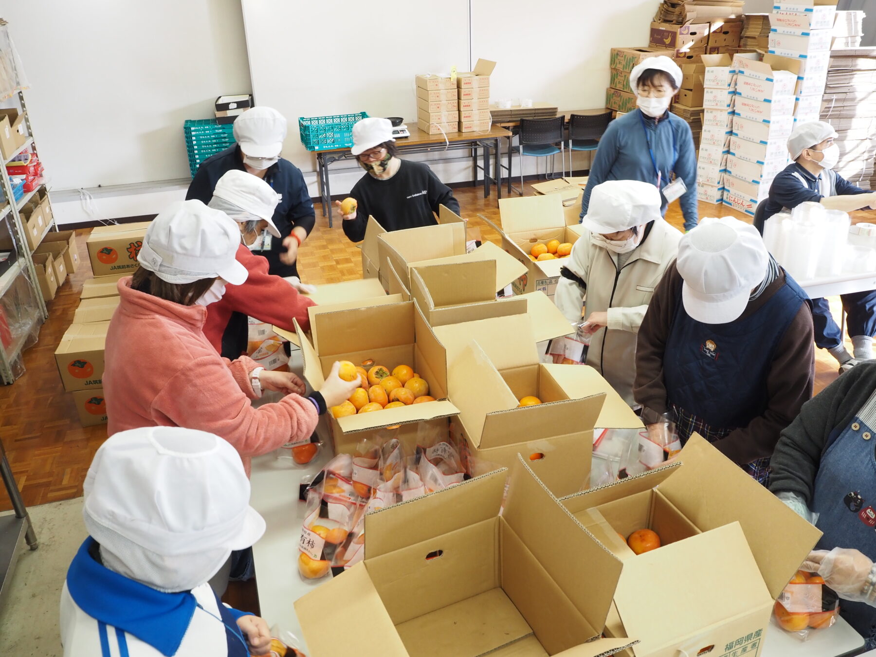 舎内で行われる野菜と果物の加工作業では、季節ごとにいろいろな種類の物が届きます。作業開始前や休憩時間には、好きな野菜や料理についての話で盛り上がっています。今は柿や梨の季節。皆さん、「こんな季節になったね~」と、寒い季節の始まりを感じているようです。