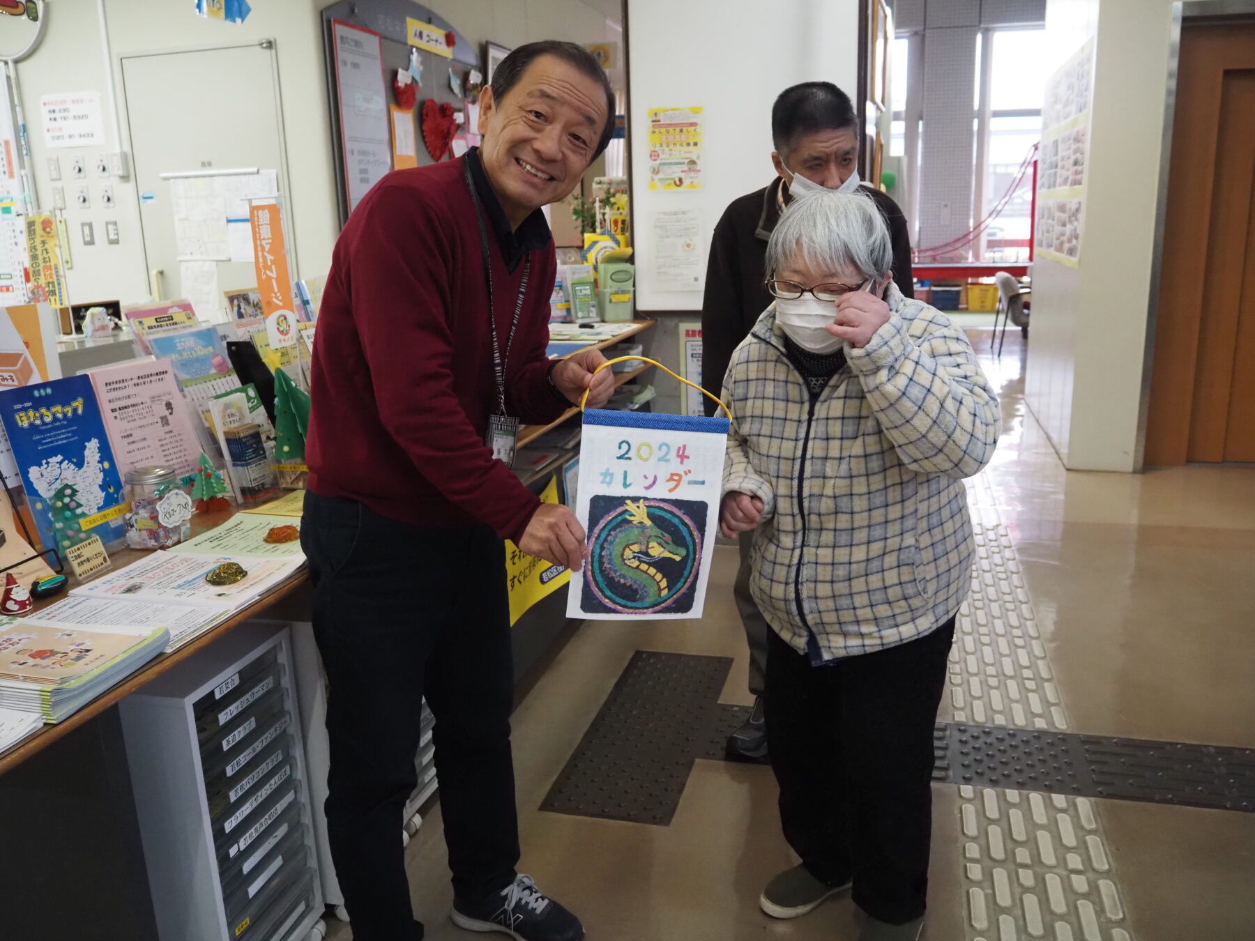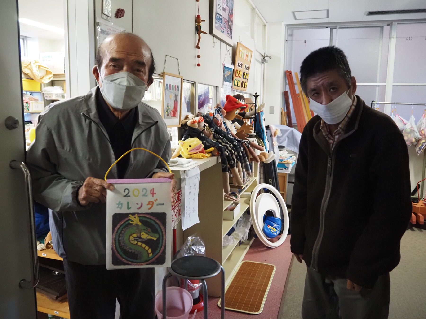 生活介護事業では、いつもお世話になっているおもちゃ図書館や若松中央公民館、町内会長さん、地域の方に感謝の意を込めて、来年のカレンダーを進呈しました。生活介護のメンバーが約1年間かけて取り組んだ作品です。手作り和紙を使って季節感溢れる貼り絵を施しました。皆さんに、とても喜んで頂けた事に感激して、「頑張って良かったです!次に作るカレンダーも頑張ります!」という前向きな言葉を笑顔で発してくれました。みなさんの頑張りに拍手です♪(濱口)