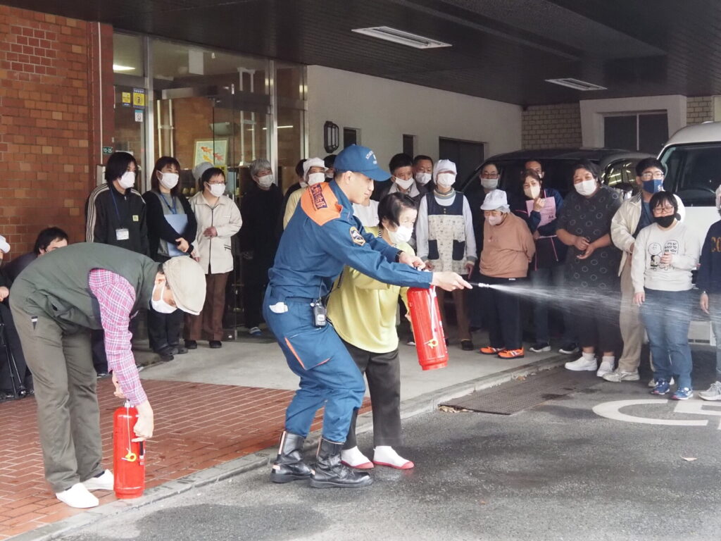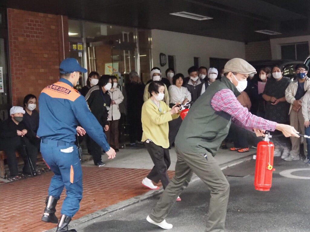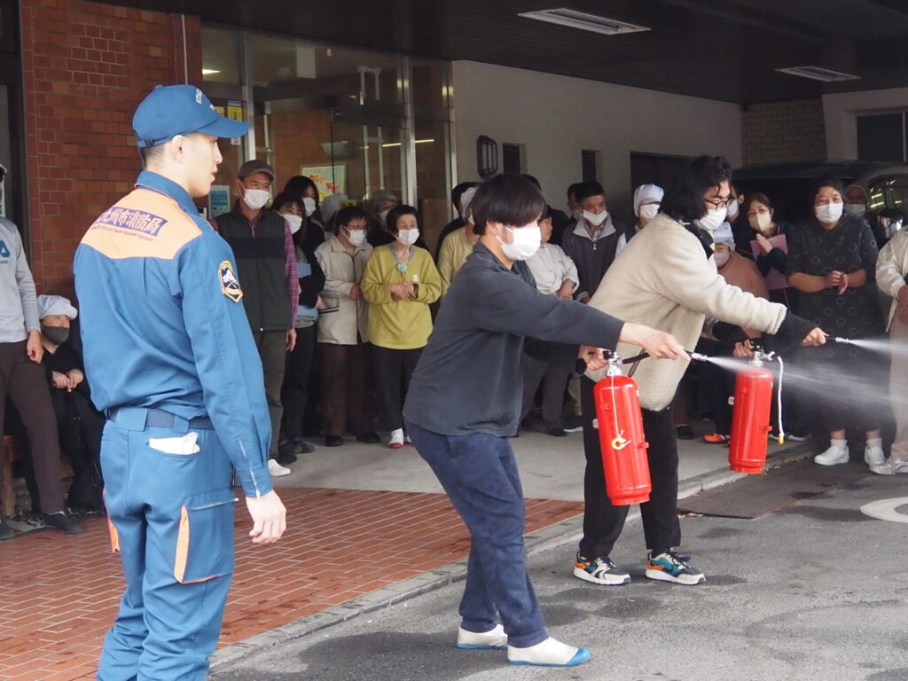 4月1 5日(水)消防立ち合いの火災想定避難訓練を行った後で消火訓練を行いました。「火事だ~」と大きな声で叫びながら、「ピノキオ」の合言葉通りに放水しました。(ピ:ピンを外す ノ:ノズルを握る キ:気を付けながら オ:押す)初めての試みに緊張した面持ちでトライした人、何度も経験している人合計8名が消火訓練を行いました。いざという時に必ず役に立ちます。自分の身を守る術を学ぶことが出来て充実した一日となりました♪(濱口)
