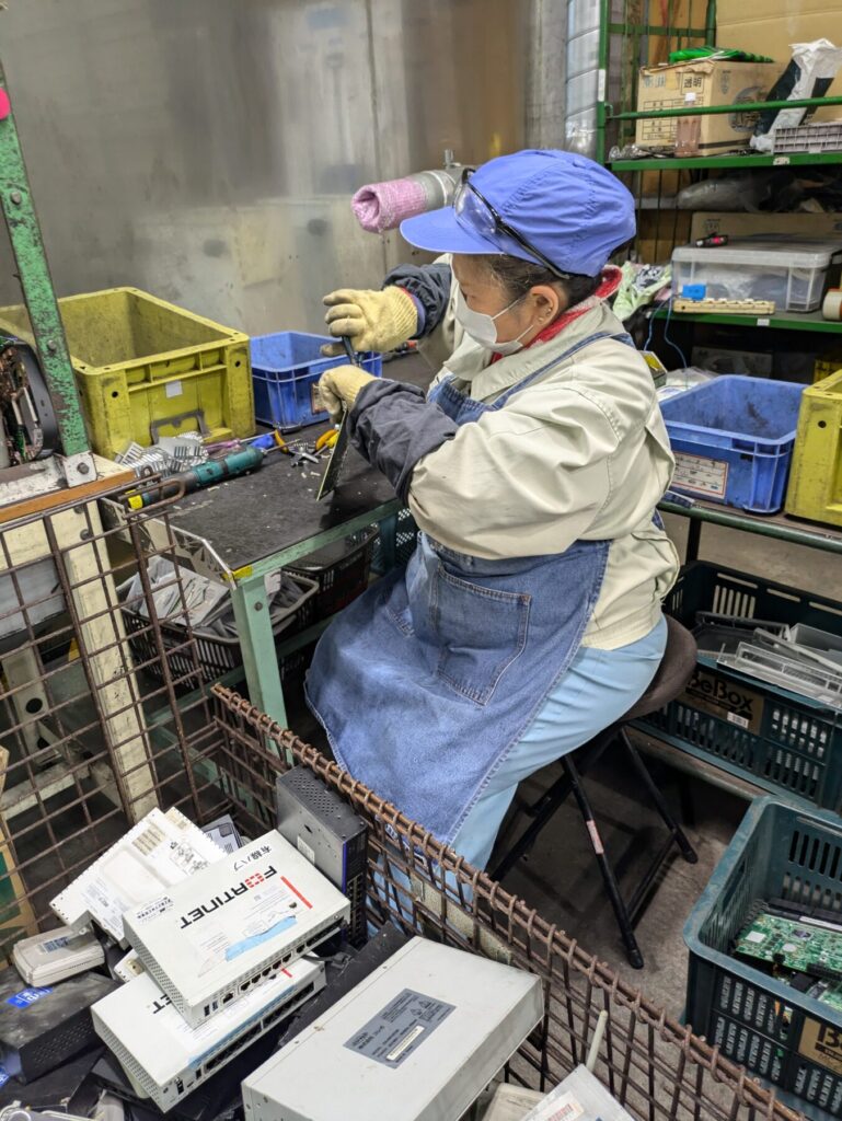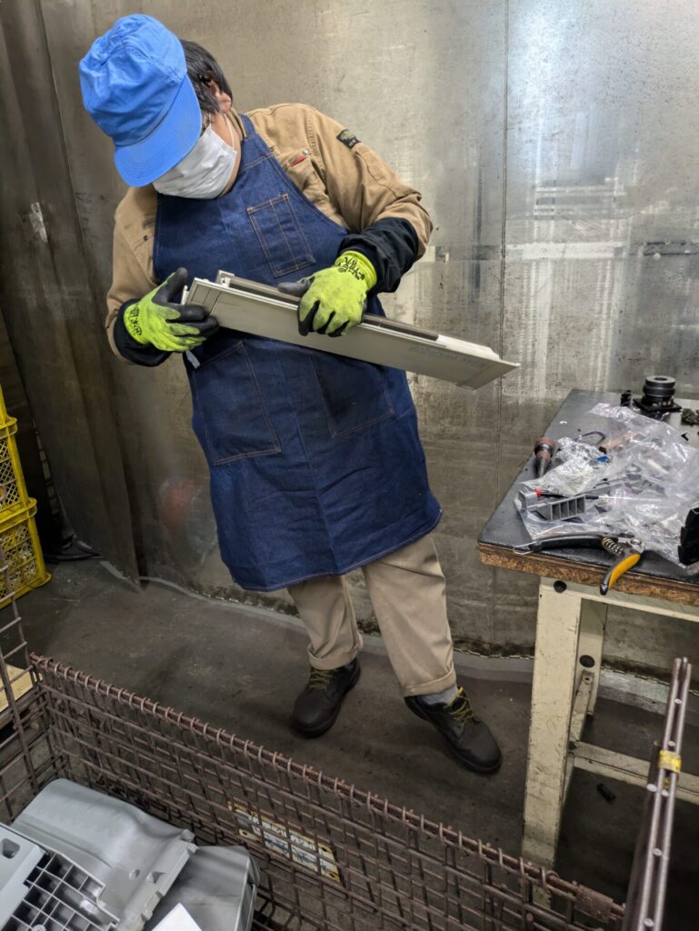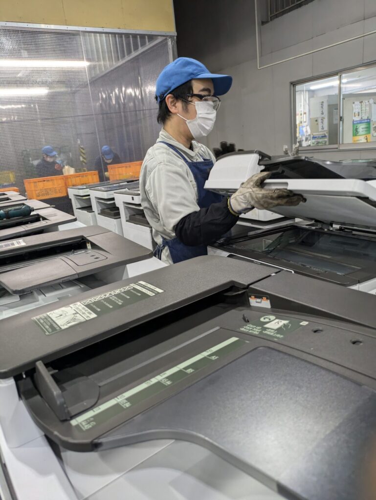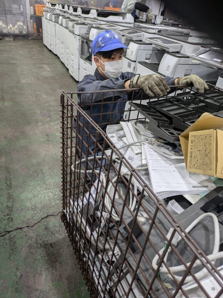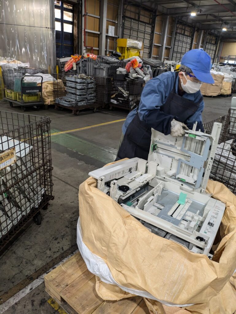 洞海工芸舎は3ヶ所舎外活動に行っています。今回はリサイクルテックの活動を紹介します。月曜から金曜日まで、6人で行っています。主にコピー機の分解をしています。上蓋とり、上蓋詰め、引き出しの中身確認、中身の分別・処理、引き出しの抜き取り、引き出しのフレコン詰めの作業があります。コピー機以外の作業は、プラスチックの仕分け、機械からのハードディスクの取り出し、ユニット分解などの作業を行っています。 コピー機の搬入は基本、一日一回ですが、朝、責任者の方から、「今日は2便です」と言われることもあります。二回目が14時ごろ搬入があっても、15時30分に帰るまでに全部処理することが出来ています。それぞれ自分の仕事をきちんと行うことにより、全体で手早い作業をすることが出来ています。これからもみんなで協力して、頑張って、働いてまいりましょう。(武田)