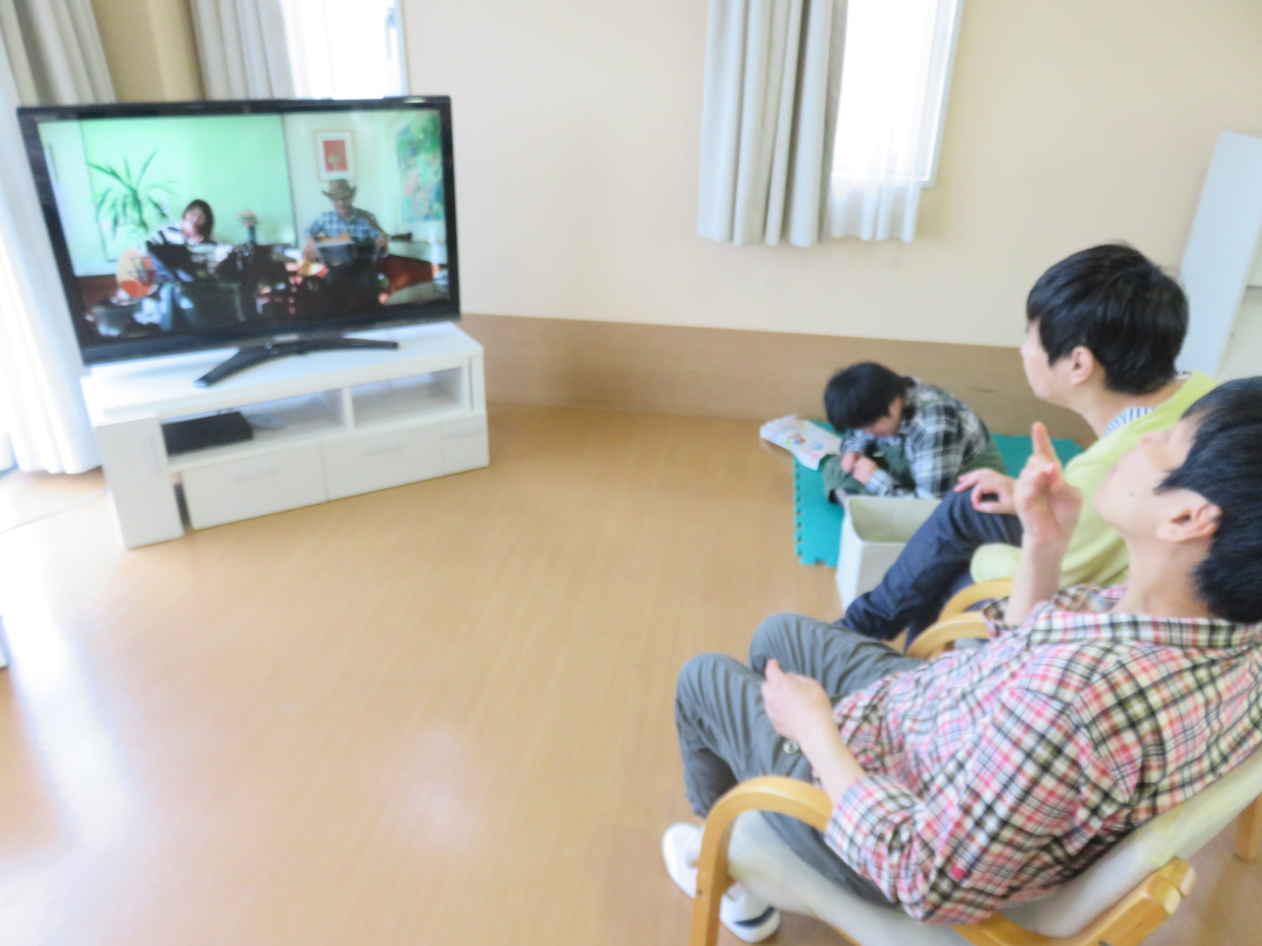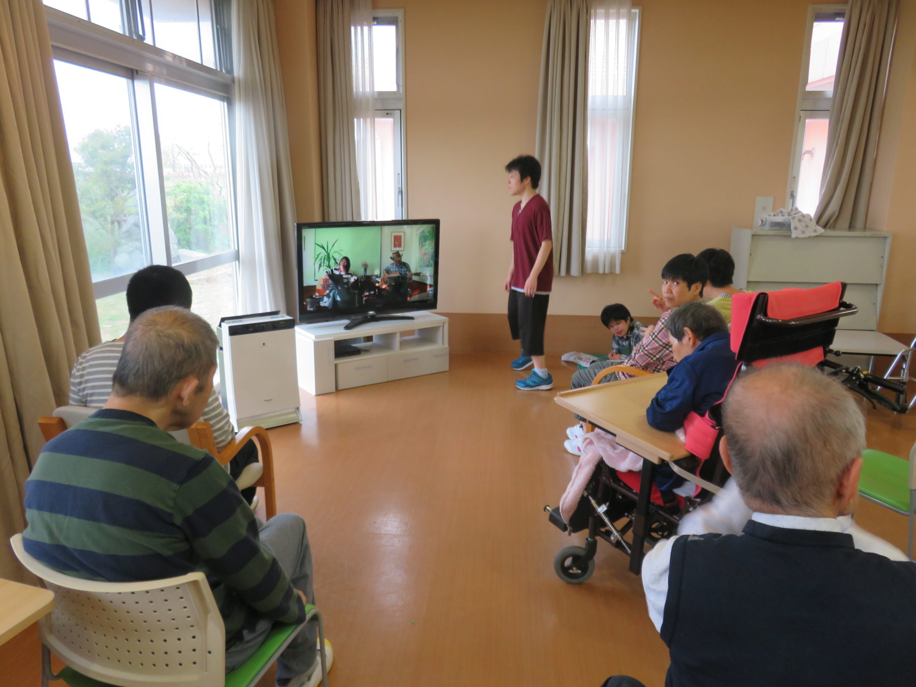 DVDを映すと皆さん大きな声で一緒にうたを歌ったり踊ったりと大喜びで施設の中が明るい雰囲気に変わりました。