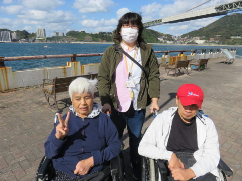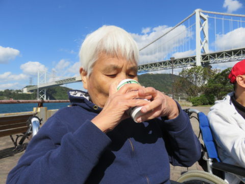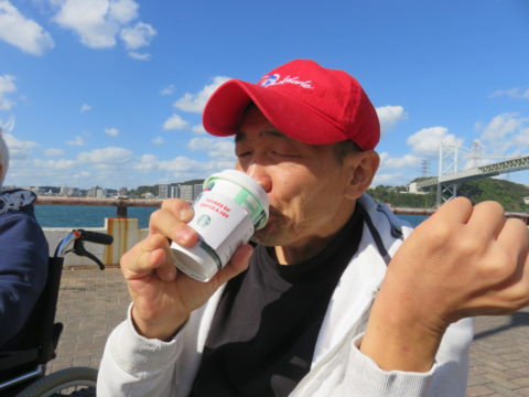 11月9日(月)、余暇外出へ行きました。門司港レトロ駅内のスターバックスで、各々好きな飲み物を選びました。今回は、お二人とも温かい飲み物をチョイスされ、その後は、和布刈公園のノーフォーク広場にて喫茶を行いました。