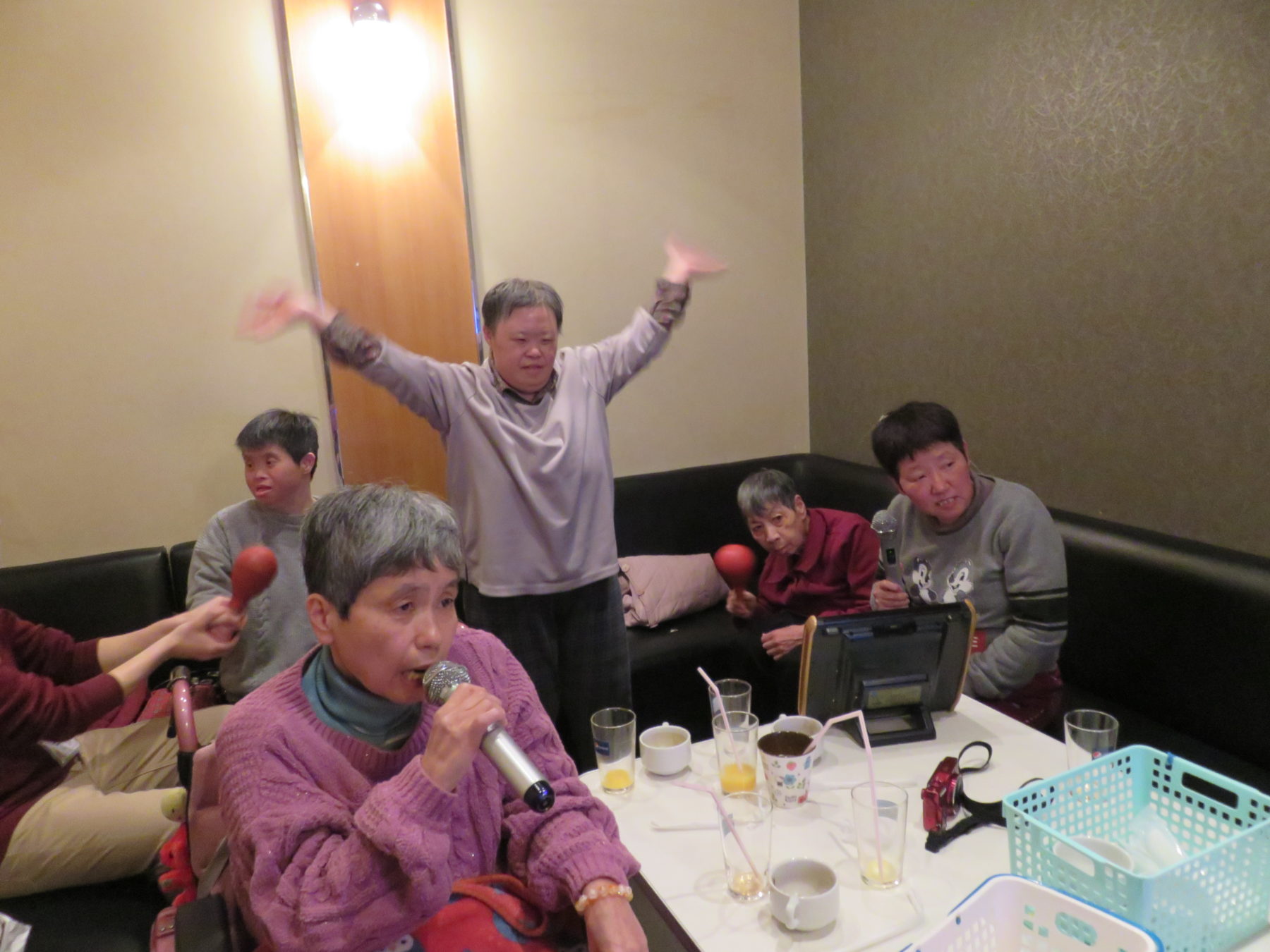 その後は待ちに待ったカラオケです!氷川きよしと歌えるデュエット曲があり、大ファンのFさんは嬉しそうに歌っていました♪その後も「ふるさと」等の演歌や、「手をたたきましょう」や「おべんとうばこ」等の童謡をみんなで大熱唱!マラカスやタンバリンを鳴らしたり、Yさんは踊り出したりしていました!大盛り上がりであっという間に時間は過ぎていきました。帰りの車内では「楽しかった!」「また行きたい!」との声!皆さん素敵な思い出になったのではないでしょうか?これからも皆さんと一緒に楽しい思い出をたくさん作っていきたいと思います!(田中)