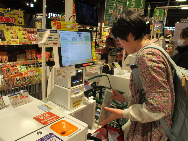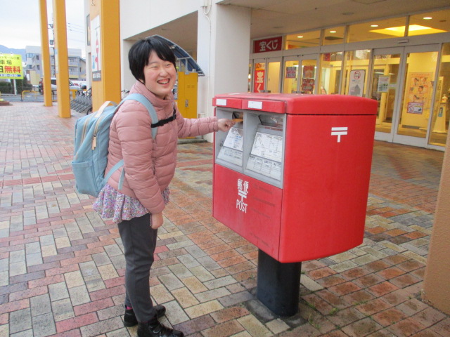 まずは、買い物へ。陳列棚から「これ!」と素早く見つけて、カートにいれます。セルフレジでは、「ポイントカードはありますか?」「支払方法は?」などのタッチパネル操作もヘルパーに確認しながら本人が行い、商品のバーコードも上手にスキャンしています。まずは買い物、完了!次は、ポストへ!封筒を入れるところを確認して、投函! 達成感いっぱいの笑顔ですね(^^♪
