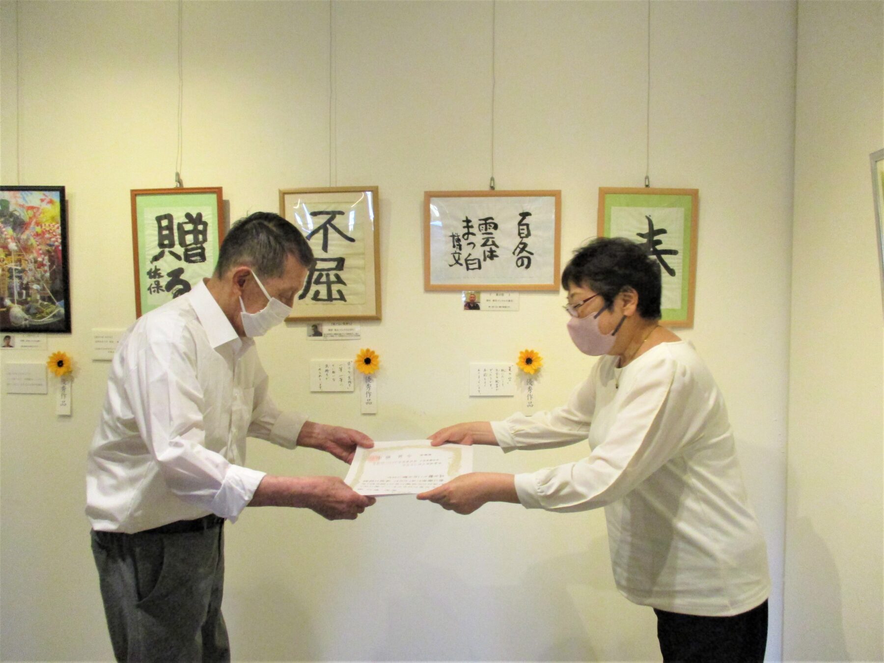 表彰式には参加出来なかったOさんの為に、作品の前で特別に表彰式をして頂きました。