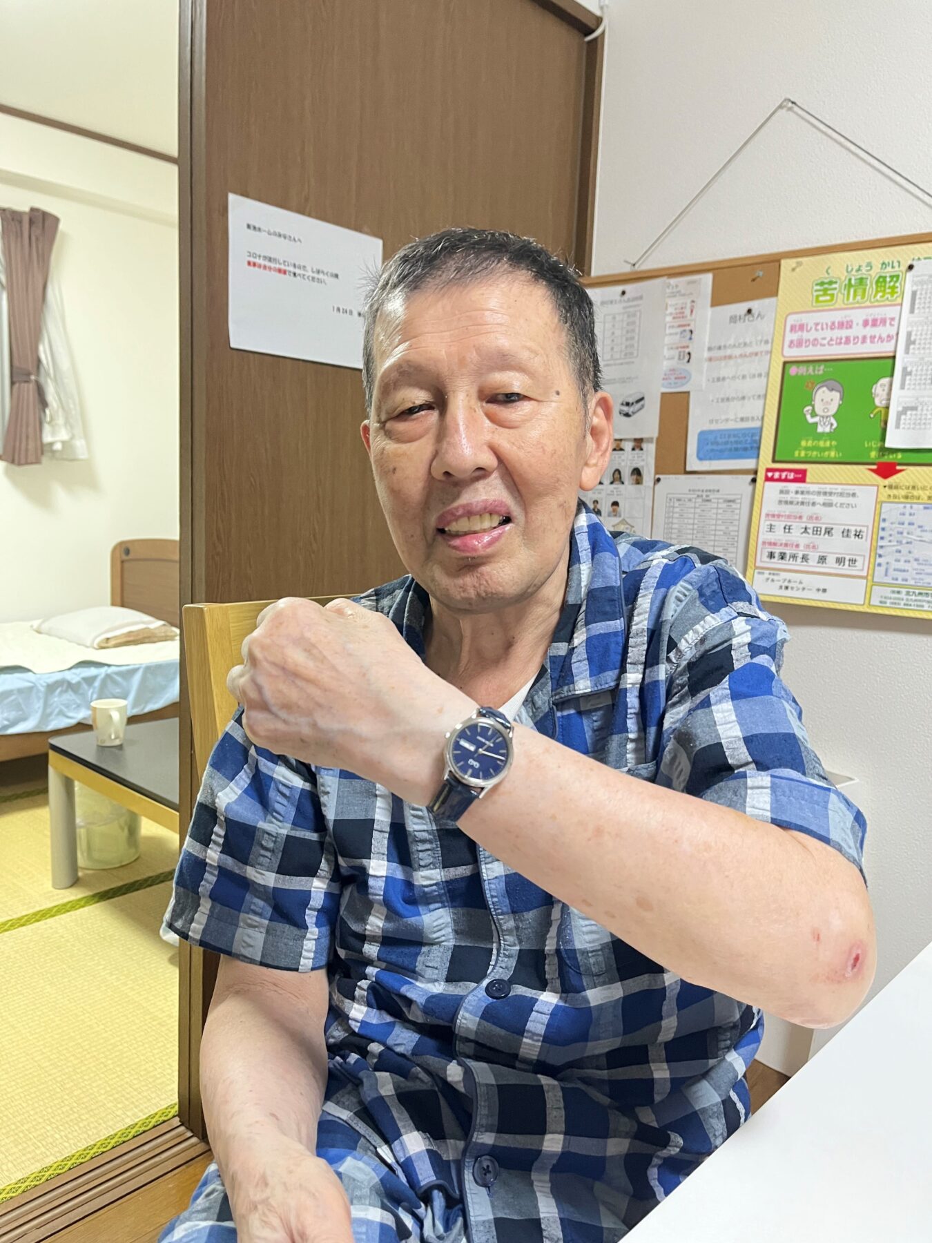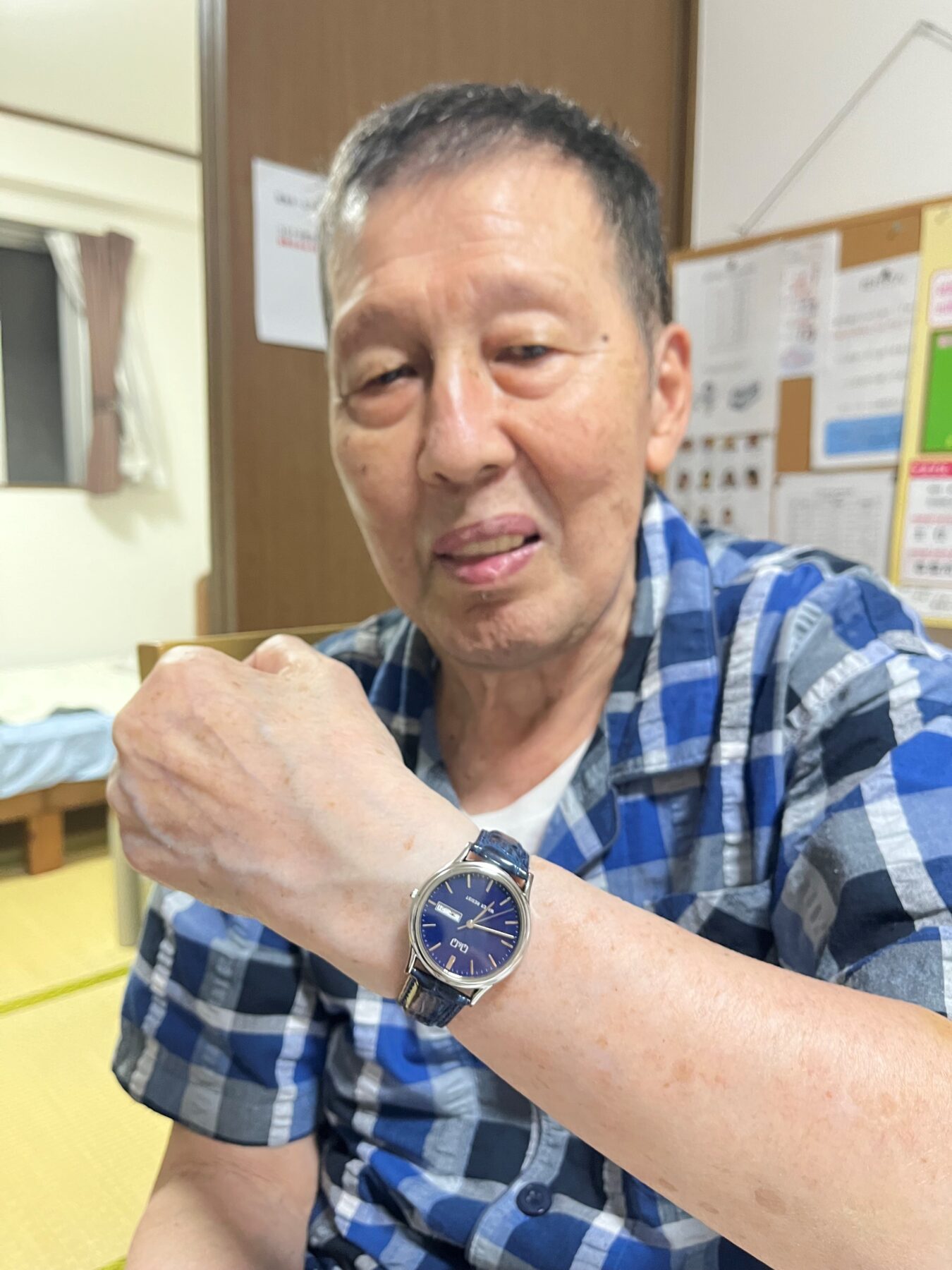 同じホームの利用者にも「やっときたよ」と腕時計を披露!「似合うね」「いいね」と言われて、少し照れていたOさんでした。