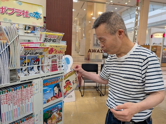 Fさんの大好きな本屋さんへ行き、沢山ある本の中から好きな絵本を真剣に選ばれていました。通所先の外出活動で初めてしたガチャガチャが記憶に残っていたようで、ガチャガチャコーナーの横を通るとじっと立ち止まるFさん。お金を渡すと好きなガチャガチャへ走って行かれました。ゲットしたキーホルダーをいつものショルダーバッグへ付けるとニコニコ笑顔を見せて下さいました。また時間がある時にプチ外出しましょうね♪