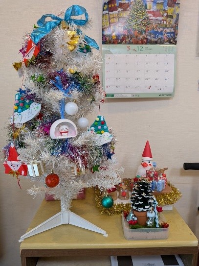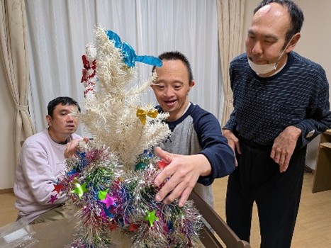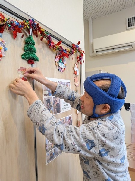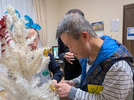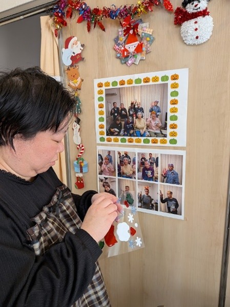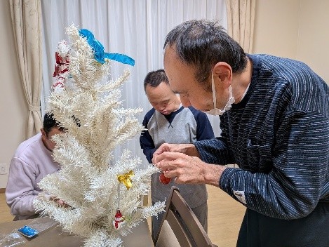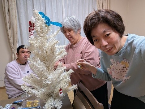 いよいよクリスマスが来週に近づいてきました🎄宮前ホームでは、クリスマスへ向けての準備が着々と進んでいます。この日は、宮前ホームの利用者さんと一緒にクリスマスの飾りつけをしました!クリスマスツリーにオーナメントを飾ったり、サンタクロースや雪だるまのウォールステッカーをリビングの壁に貼ったりしました。世話人さん達もお手製のクリスマスグッズを作成してくださり、クリスマスツリーの横に飾らせていただきました。華やかでキラキラしたリビングが出来上がり、来週のクリスマスがより待ち遠しくなったようでした✨