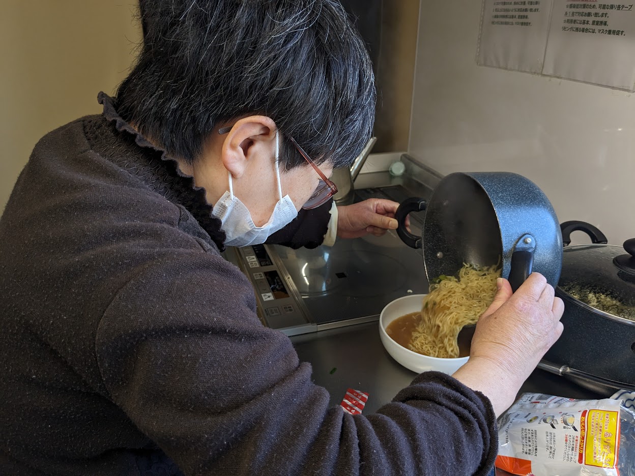 赤崎ホームで生活をしているNさん。普段は近くのコンビニでパンを買ったり、お弁当を頼んだりすることが多いですが、今日のお昼ご飯は自分でラーメンを作ると意気込んでいました!