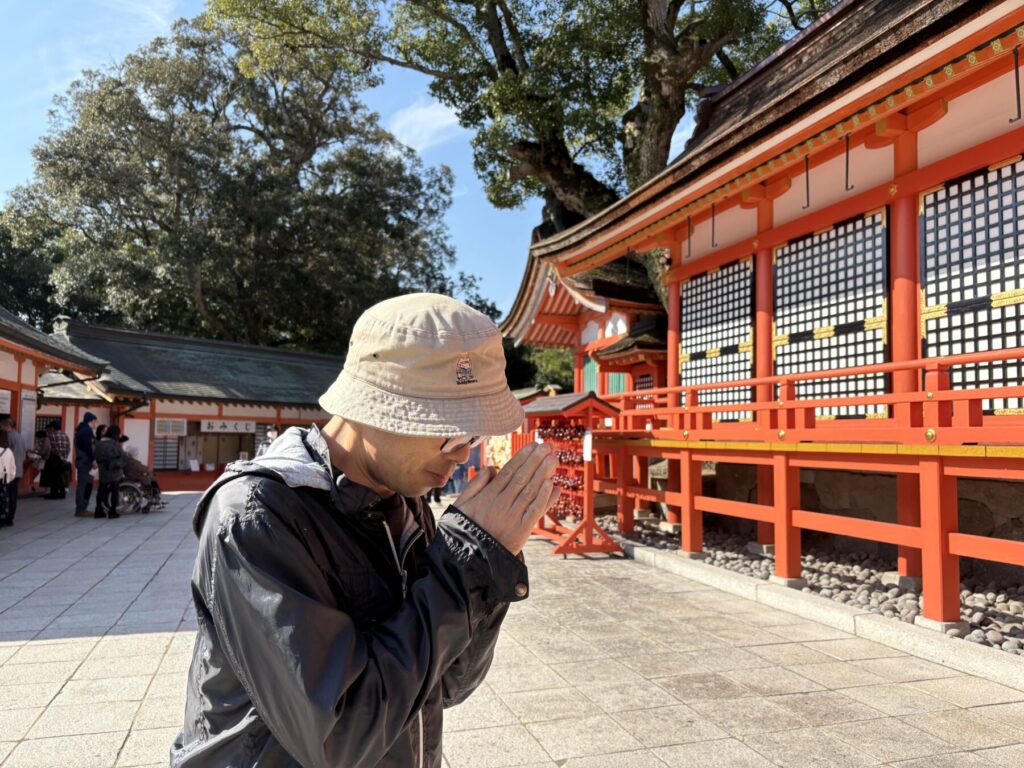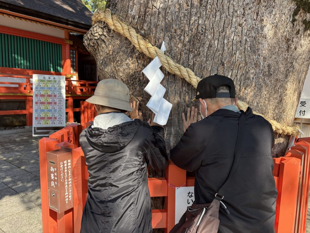 宇佐神宮でのお参りでは、樹齢約800年ともいわれているご神木にも触れ、