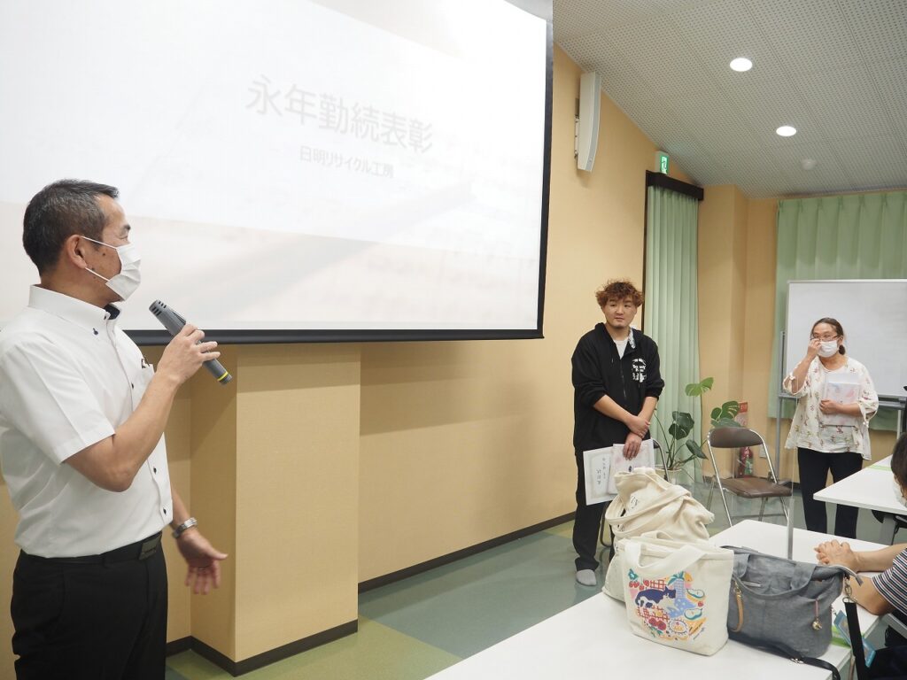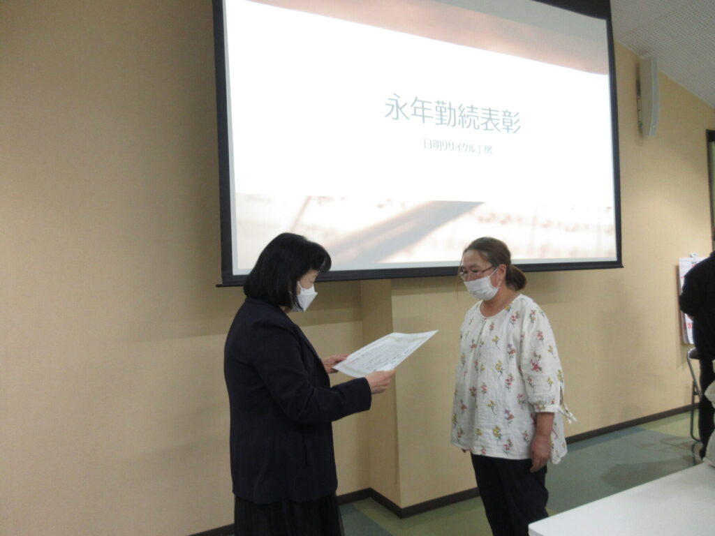 HOME 事業所NEWS 永年勤続表彰 事業所NEWS 全一覧 本部 門司区 小倉北区 小倉南区 戸畑区 若松区 八幡東区 八幡西区 NEW2025年10月17日 小倉北区 日明リサイクル工房 永年勤続表彰 日明リサイクル工房では今年度、2名の従業員が永年勤続の表彰を受けました。 永年勤続表彰式を行い、小松理事長から賞状と記念品が手渡されました。受賞の挨拶では、受賞の喜びと感謝、今後への意欲が伝わってきました。 勤続30年と10年の節目を皆でお祝いし、有意義な時間となりました。 勤続30年のNさん、10年のKさん、おめでとうございます!(藤田) 最新ニュース NEW 2025年10月16日 八幡西区 ショートステイやちよ 合言葉は「お・は・し・も」 先日ショートステイやちよでは夜間の火事を想定して避難訓練を行... NEW 2025年10月08日 戸畑区 インクルとばた お月見団子 10/6、中秋の名月にちなんで月見団子をみんなで食べました!... NEW 2025年09月29日 八幡西区 グループホーム支援センター西部 盛り上げ上手 9月のある休日。香月ホーム、楠橋ホームの中から希望者を募り... アーカイブ 2025年10月 2025年9月 2025年8月 2025年7月 2025年6月