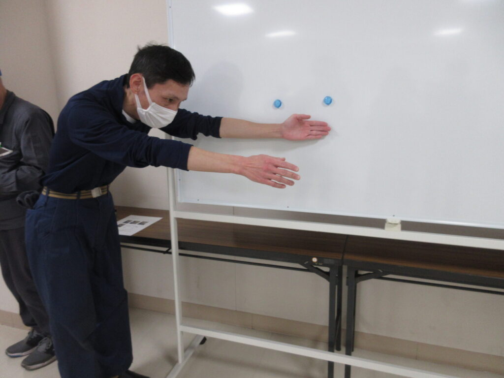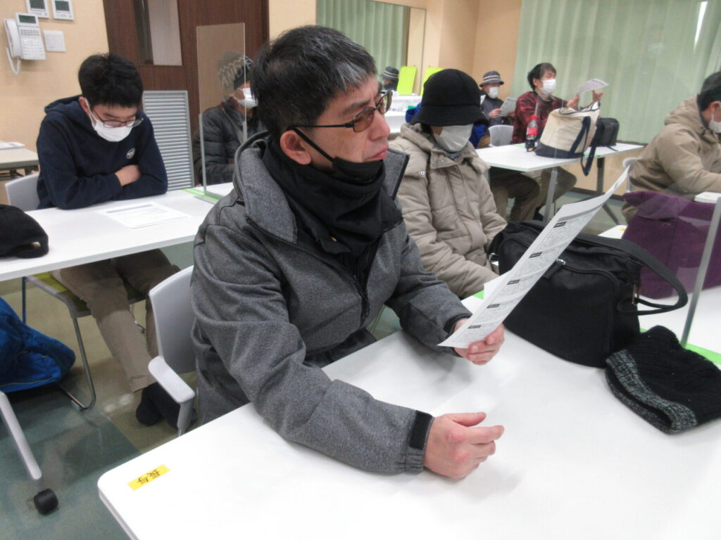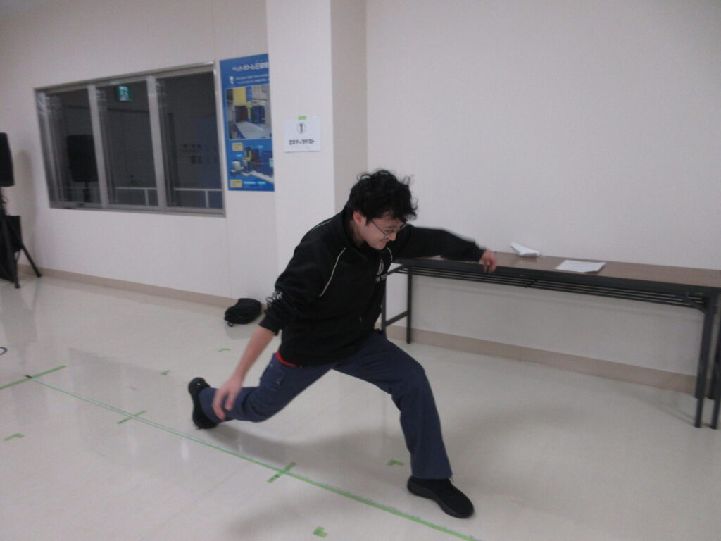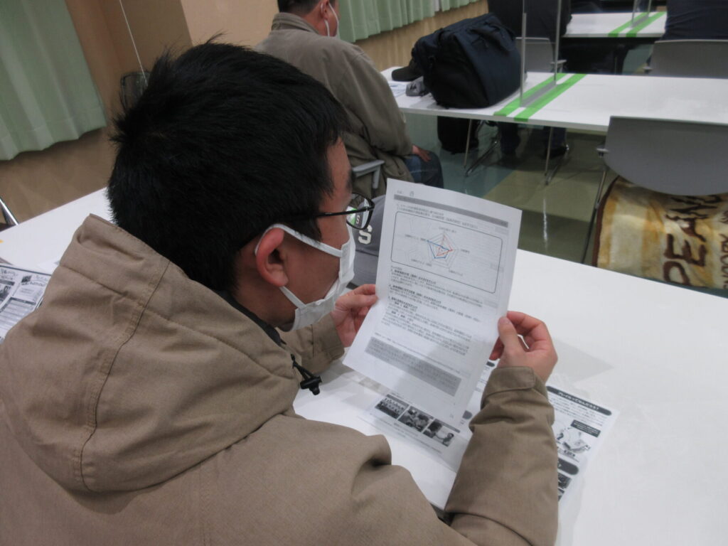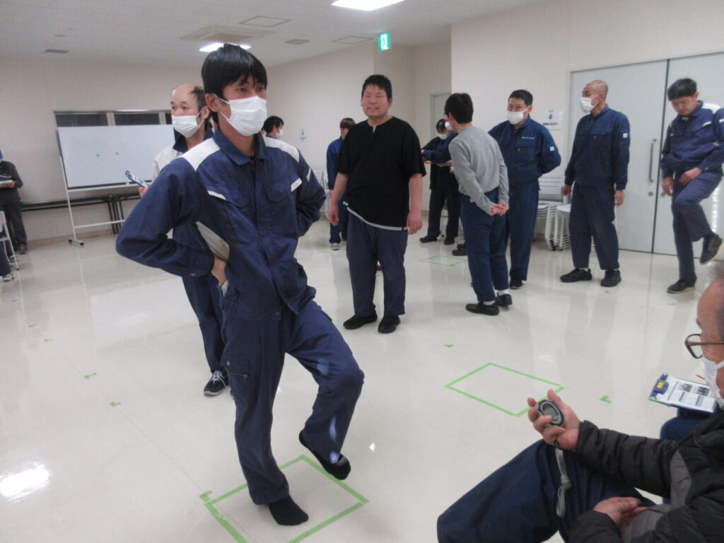 「人ごみの中、正面から来る人にぶつからず、よけて歩けますか?」等の身体的特性の質問票を記入し、5つの項目に沿って身体機能測定を実施しました。