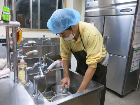 寒さもいよいよ厳しくなりつつあるこの頃。そんな肌寒い日の朝でも、Sさんは調理当番の時間に遅れず参加。テーブルを拭いたり、使用済みの調理器具を一生懸命洗っていました。飛翔館に入所して半年以上が経過したSさんですが、まだまだ調理当番には慣れず、緊張するそうです。しかし最近は味噌汁の調合など新しいことにも挑戦しているよう。今後も、調理の奥深さ、他の利用者の方との交流の楽しさを感じていただけたらと思います。