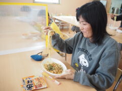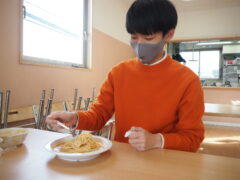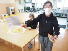 ある週末のお昼、飛翔館では自由参加のパスタパーティーを開催しました。参加費は無料で、好きなパスタソースを各自お店で事前に購入していただくようお知らせを出し、約15名の利用者さんが参加されました。そのままかけるのかレンジで温めるのかなどソースの使い方を確認しながら、楽しく食べていただけました。大盛り、小盛り、おかわりなど、自分の好きな量でゆっくり食べられるのもおうち時間の良さですね。今回は職員が企画しましたが、利用者さんからの様々なイベントの提案もお待ちしています。