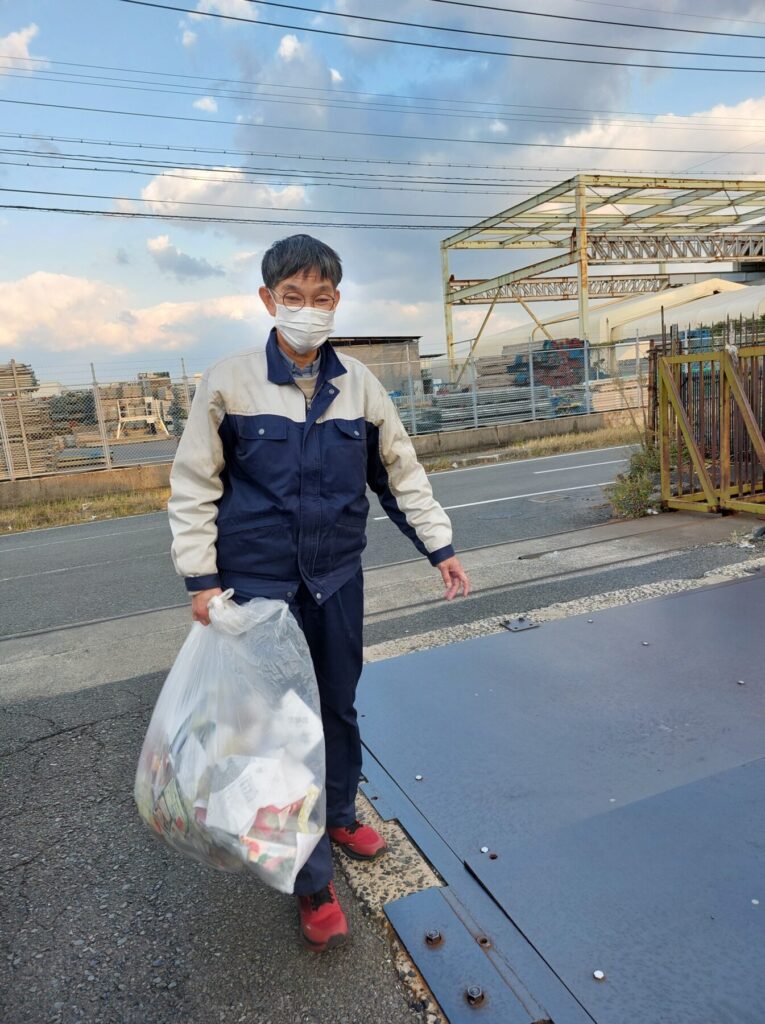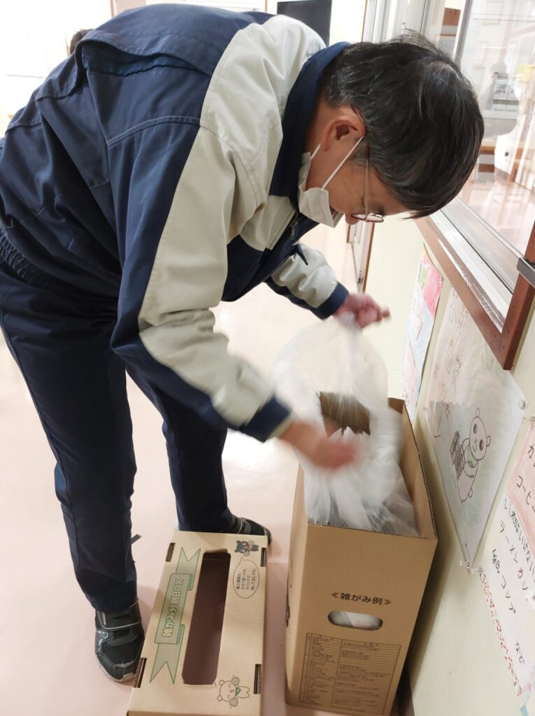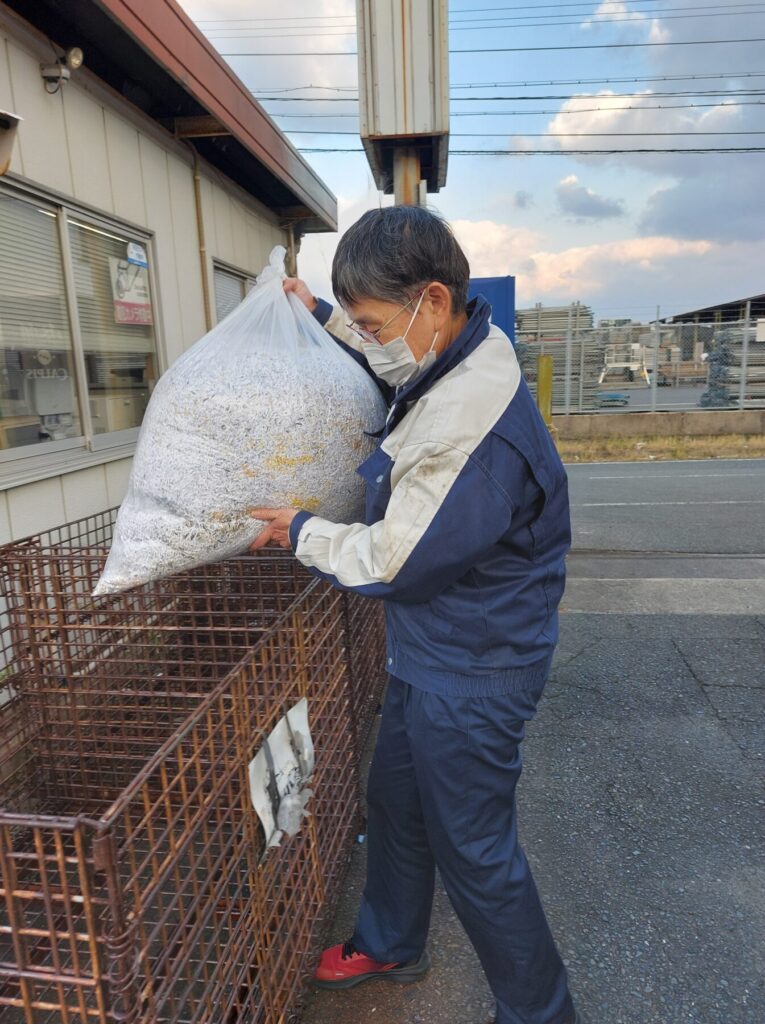 従業員のAさんは、日々集まった古紙やペットボトルのキャップを整理したり、近くの回収場へ持っていくエコ活動責任者の役割を担っています。