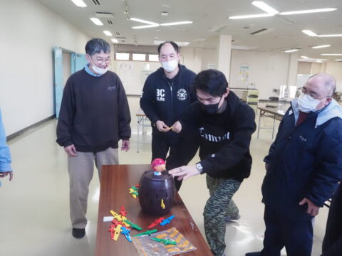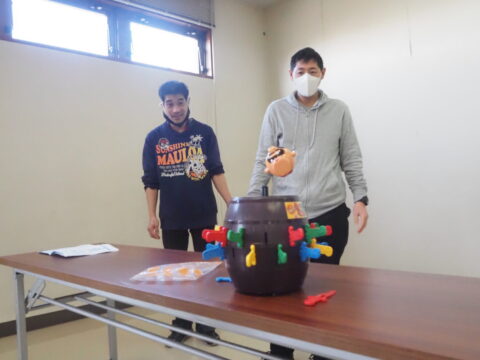 次はグループに分かれゲームを楽しみました!各グループの中でも一際盛り上がるゲームがありました。それは黒ひげ危機一髪です🗡️皆さん、遊んだことはありますか?剣を樽の穴へ1人ずつ順番に刺していき、黒ひげの人形が飛び出した人が負けという簡単なルールのゲームですが、人形がいつ飛び出てくるかハラハラ、ドキドキ😳皆さん、大いに盛り上がりました👏