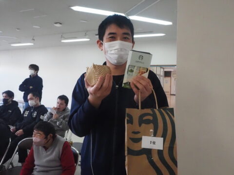 新年会、最後は、ビンゴ大会です!「なかなか揃わないですね。」「その数字はないですね。」と苦戦される皆さん…。そんな中、Tさんが無事ビンゴとなり、一位の景品をゲットしました。おめでとうございます🥇