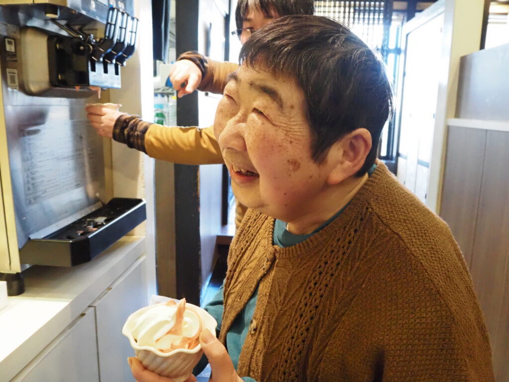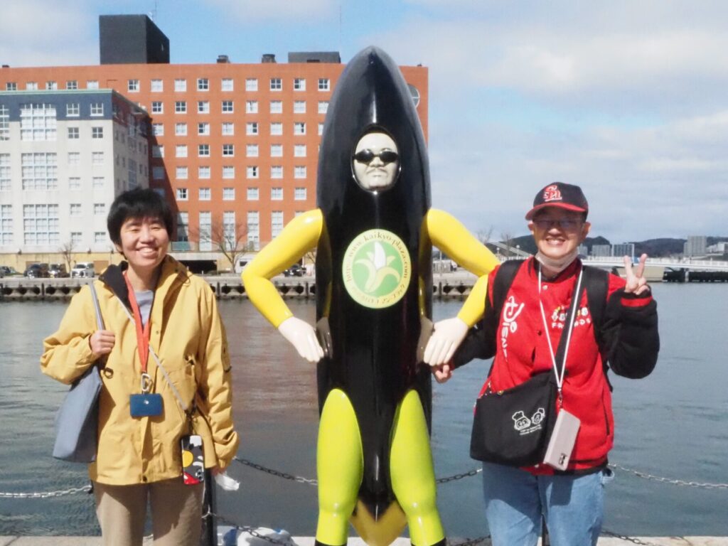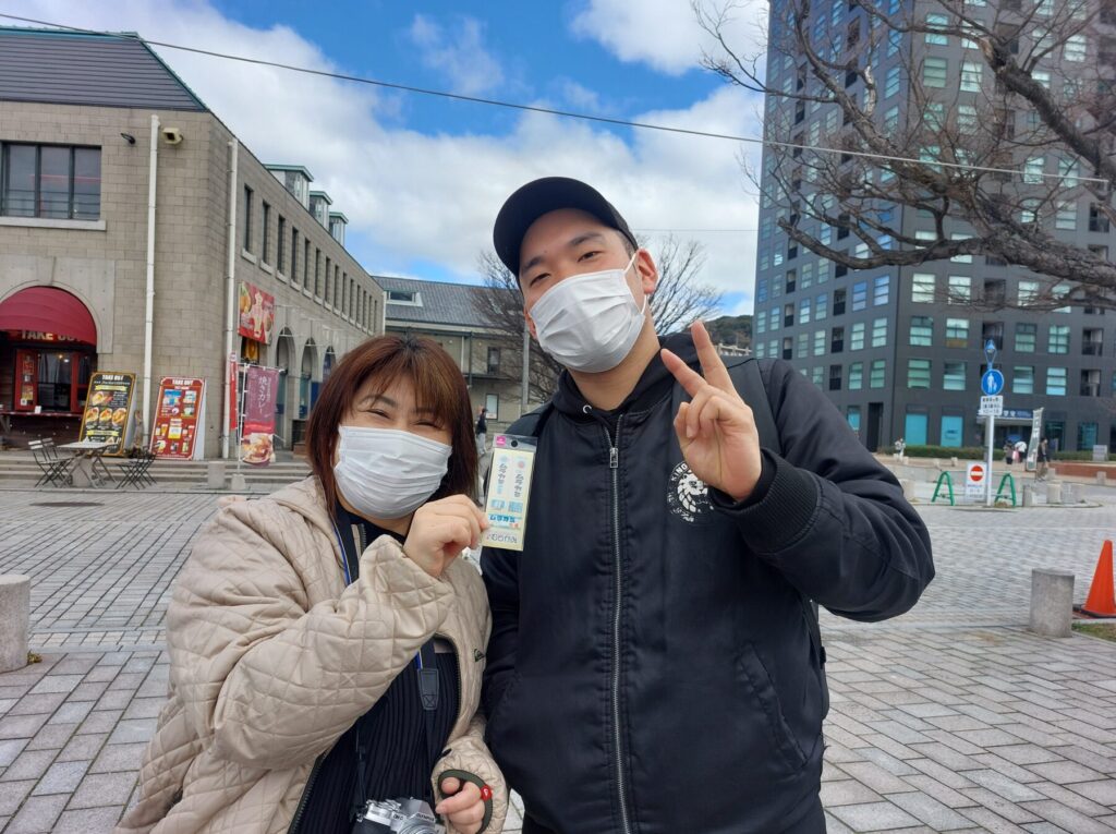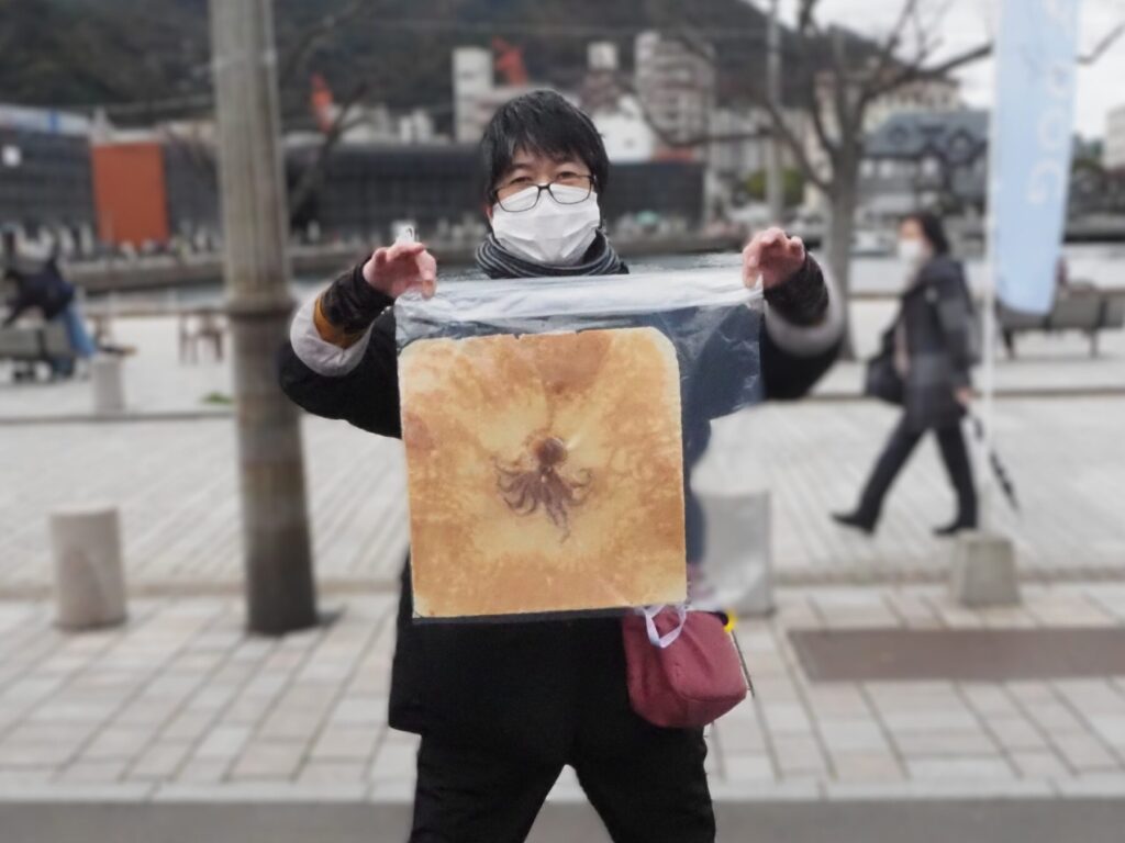 グループに分かれて門司港散策開始!テレビの門司港特集で見たと、大きなタコ煎餅をお土産に買うTさん。顔の何倍も大きなサイズの煎餅、見るだけでも圧巻されます🐙