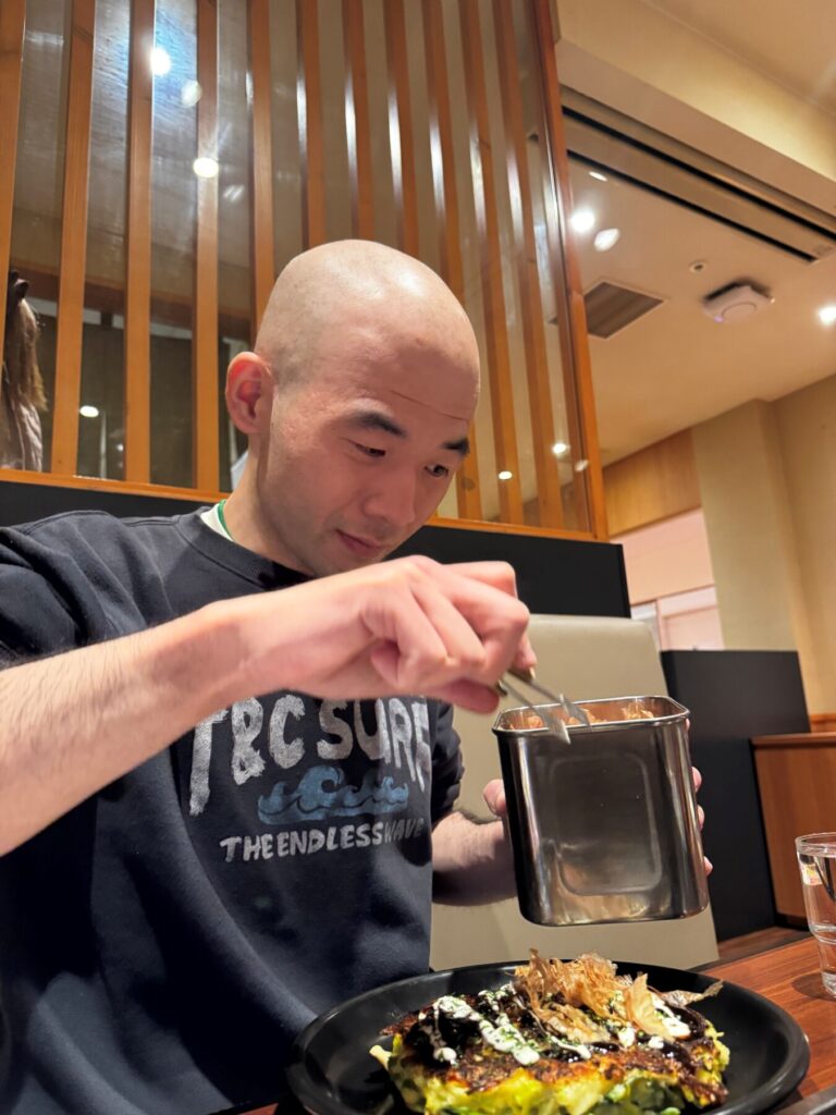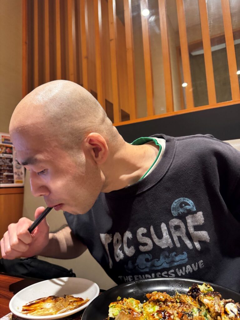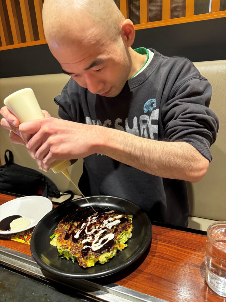 出来上がった生地上に少し笑みを浮かべながらソースやマヨネーズ、青のりやかつお節をトッピング♪器用にヘラでカットした後は、あっという間の完食でした。