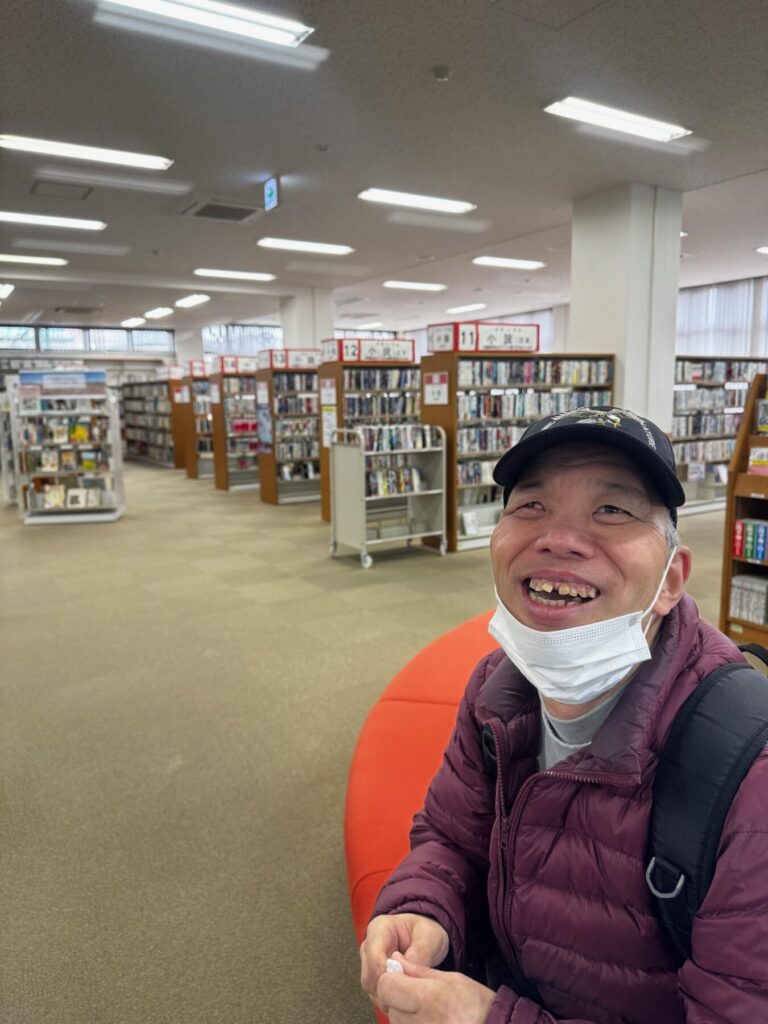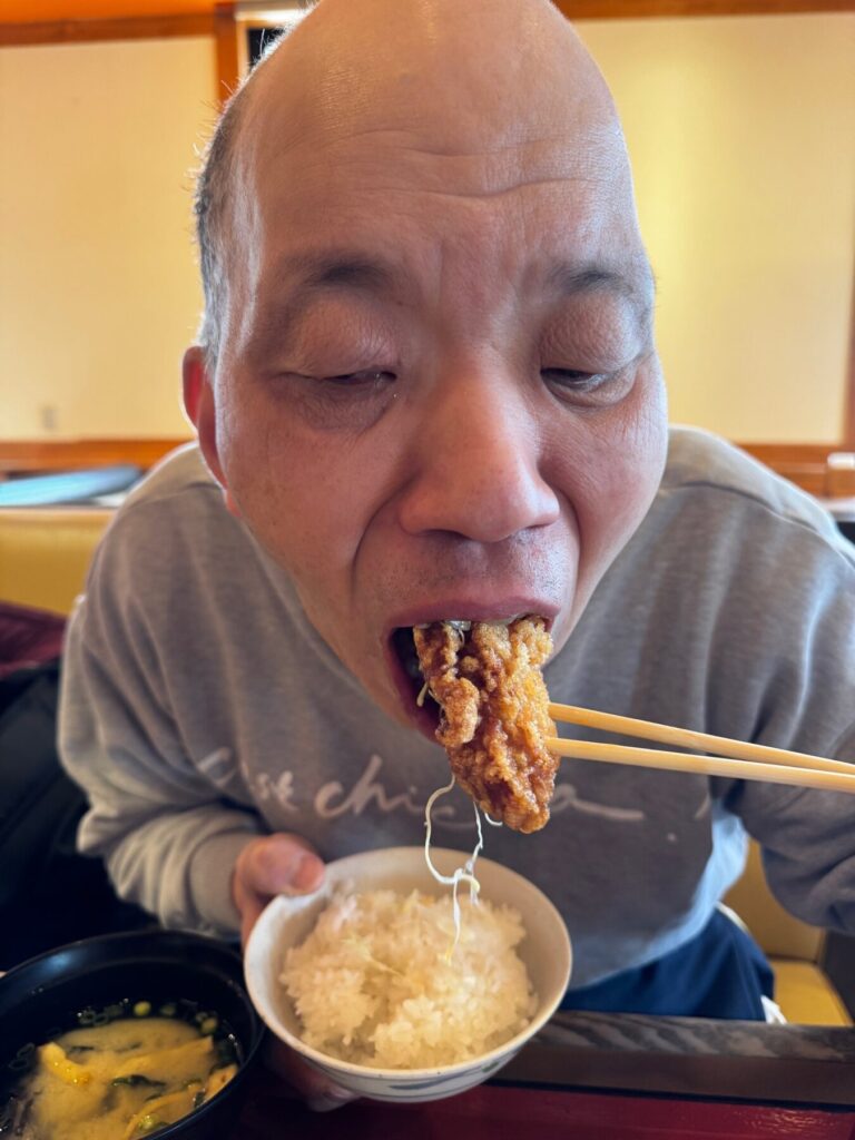 筑豊電鉄を利用するために、ウォーキングを兼ねてゆっくり歩くKさん。帰りは西鉄バスに乗りたいと希望されました。中間駅方面を散策していると、好物の「からあげ店」を発見!図書館で休憩したあとの昼食では、大好きな「からあげ」を堪能していました☆