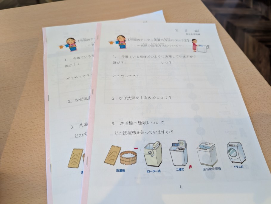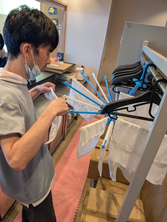その他、週に一度の洗濯プログラムを行い、洗濯機の使い方や衣類の干し方等の学習を行い身の回りの事が少しずつ自分達で行えるよう練習を行っています。