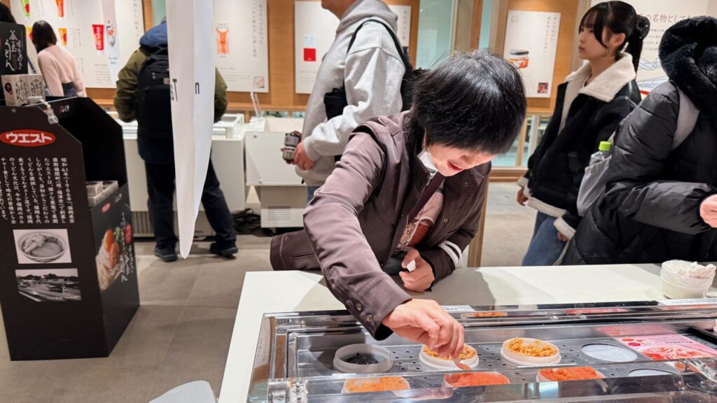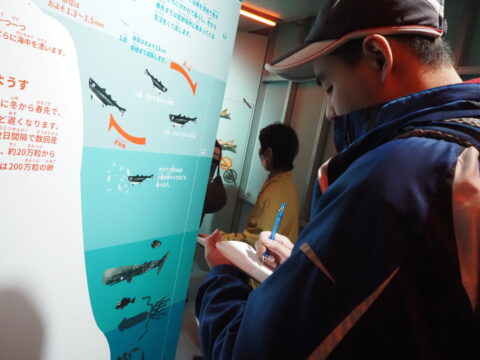 B型事業では、ふくやの明太子工場見学に出かけました!久しぶりの外出活動に胸を弾ませながら、いざ見学へ!明太子が詰められ、パックに封がされ、箱に入っていく様子をメモに取ったり写真に撮ったりしながら進んで行きます。Kさんは段ボールの並べ方を見て、日頃作業で商品を梱包した際と同じ並べ方をしていることに気づき、熱心に見学する様子が見られていました。また、用意されていたクイズの答えをチームごとに協力して見つけたり、顔出しパネルで明太子になりきったりと皆さん工場見学を楽しまれていました!