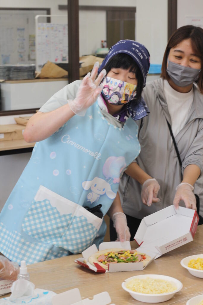 9月20日(土)は生憎の雨でしたが、インクル小倉北の利用者さんたちは元気にピザ作り(トッピング作業)に挑戦しました。生活介護の利用者の方の中には以前から楽しみにしていた方もいて、当日にはマイエプロンやマイバンダナで参戦する等して、大変な気合を感じました。