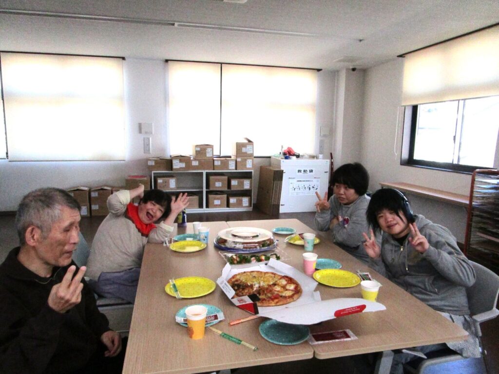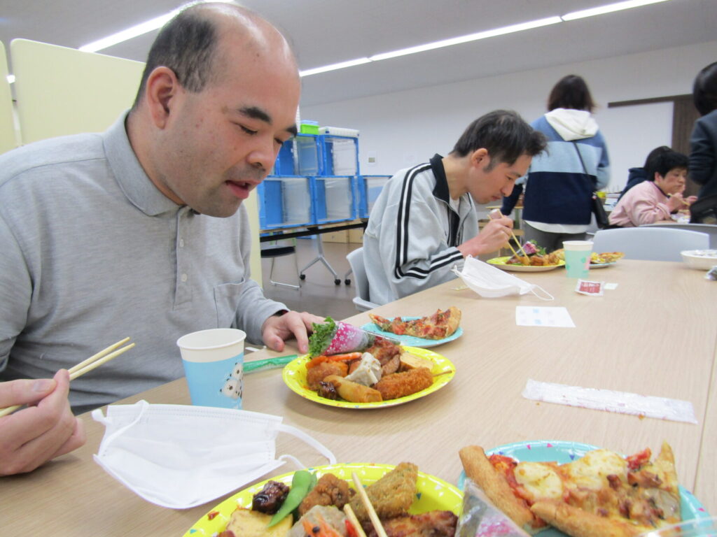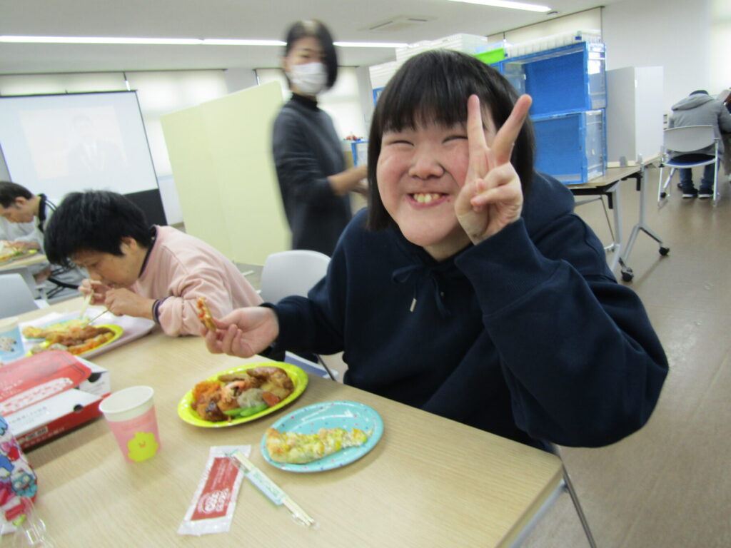 12月28日、今年最後の開所日に「みんなで1年をふりかえる会」を各事業で行いました。生活介護事業では、まずはご馳走でお腹を満たしていただきました。
