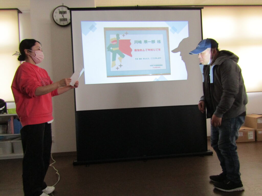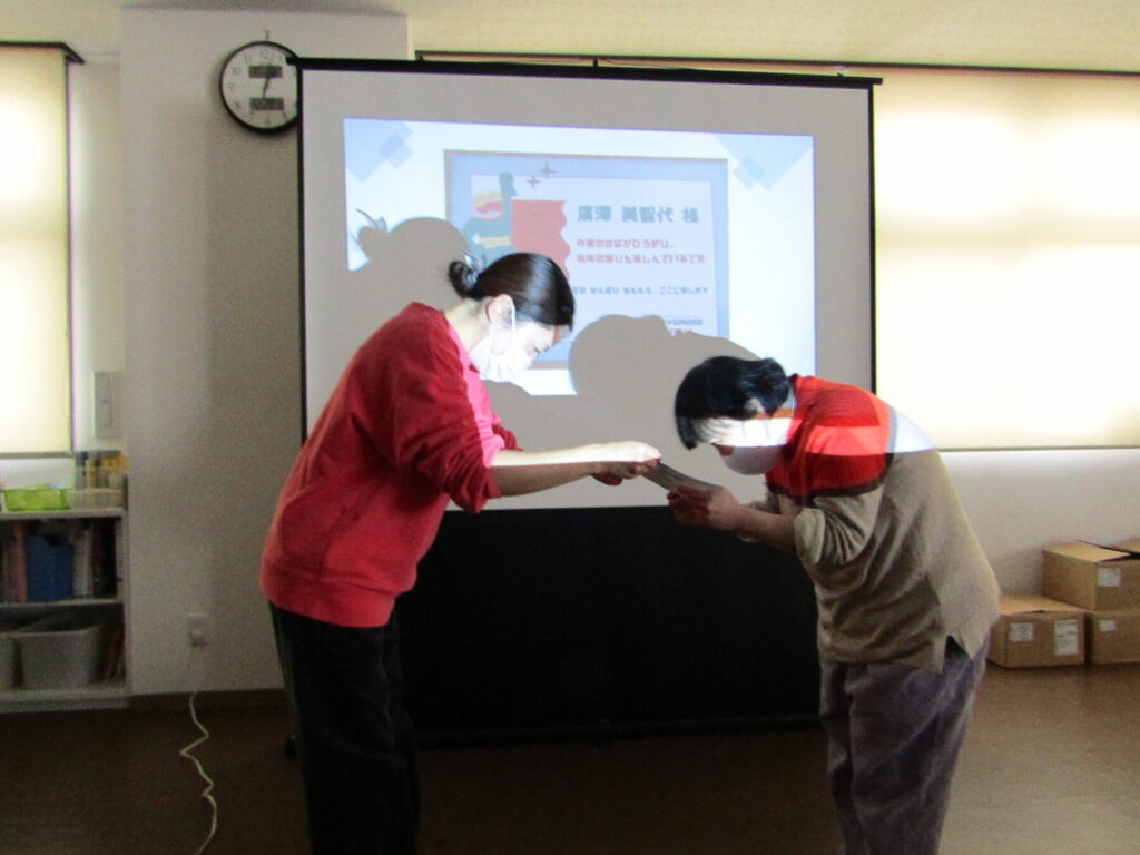 最後に、それぞれの利用者の方が1年間頑張ってきたことや、日ごろの様子の中で素晴らしい点を表彰しました。