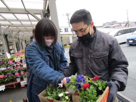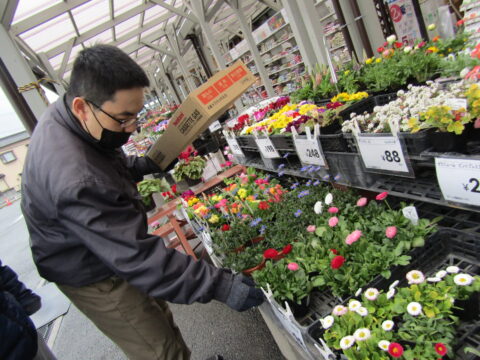 前回植えたチューリップとネモフィラとは別の花壇にも、新しいお花を植えたいという声が上がり、お花咲かせ隊で話し合いを行いました。「どんな色のお花がいいかな」と事前に相談し、いよいよホームセンターへ出発。