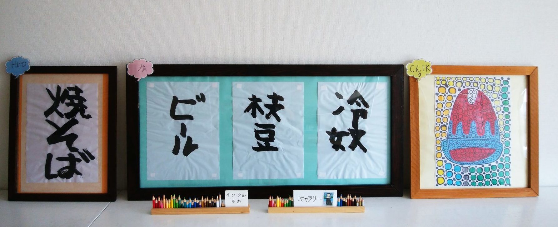 左からOさんの習字「屋台の定番」、Aさんの習字「夏の大人の風物詩」、Tさんの絵画「僕の好きな味」(昨年の、第11回北九州市障害者芸術祭 実行委員長賞受賞作品)です。夏は暑さが厳しく出掛けることが億劫になってしまう時もありますが、屋台ならではのものや、夏だからこそ特に美味しく感じるものもたくさんあります。熱中症対策等注意も必要ですが、まだまだ続く夏を楽しみたいと思いました。(佐藤)