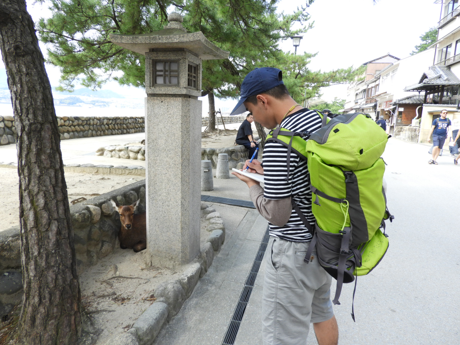 1日目は広島県の宮島で観光ともみじ饅頭作り体験を行いました。宮島では、厳島神社の近くまで行く班と商店街の散策がメインの班の二つに分かれて行動しました。厳島神社の鳥居は、残念ながら工事中でほとんど隠れてしまっていましたが、現地の人によると70年に一度くらいの工事と言うことで、珍しい鳥居の姿を見ることが出来ました。商店街では、お土産を買ったり、ソフトクリームを買って食べたり、鹿を間近でみるなどして過ごしました。
