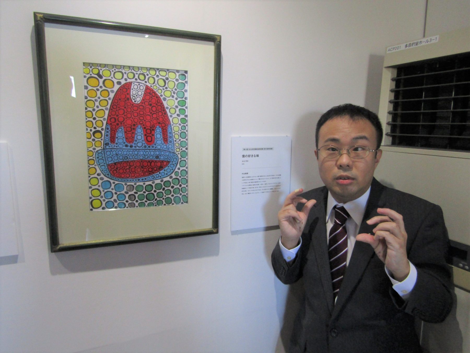 北九州での開催にあたり、障害者アートとして、過去の北九州市障害者芸術祭の受賞作品の中から2作品が選ばれることになり、インクル曽根の友近邦宏さんの作品『僕の好きな味』が再受賞しました。