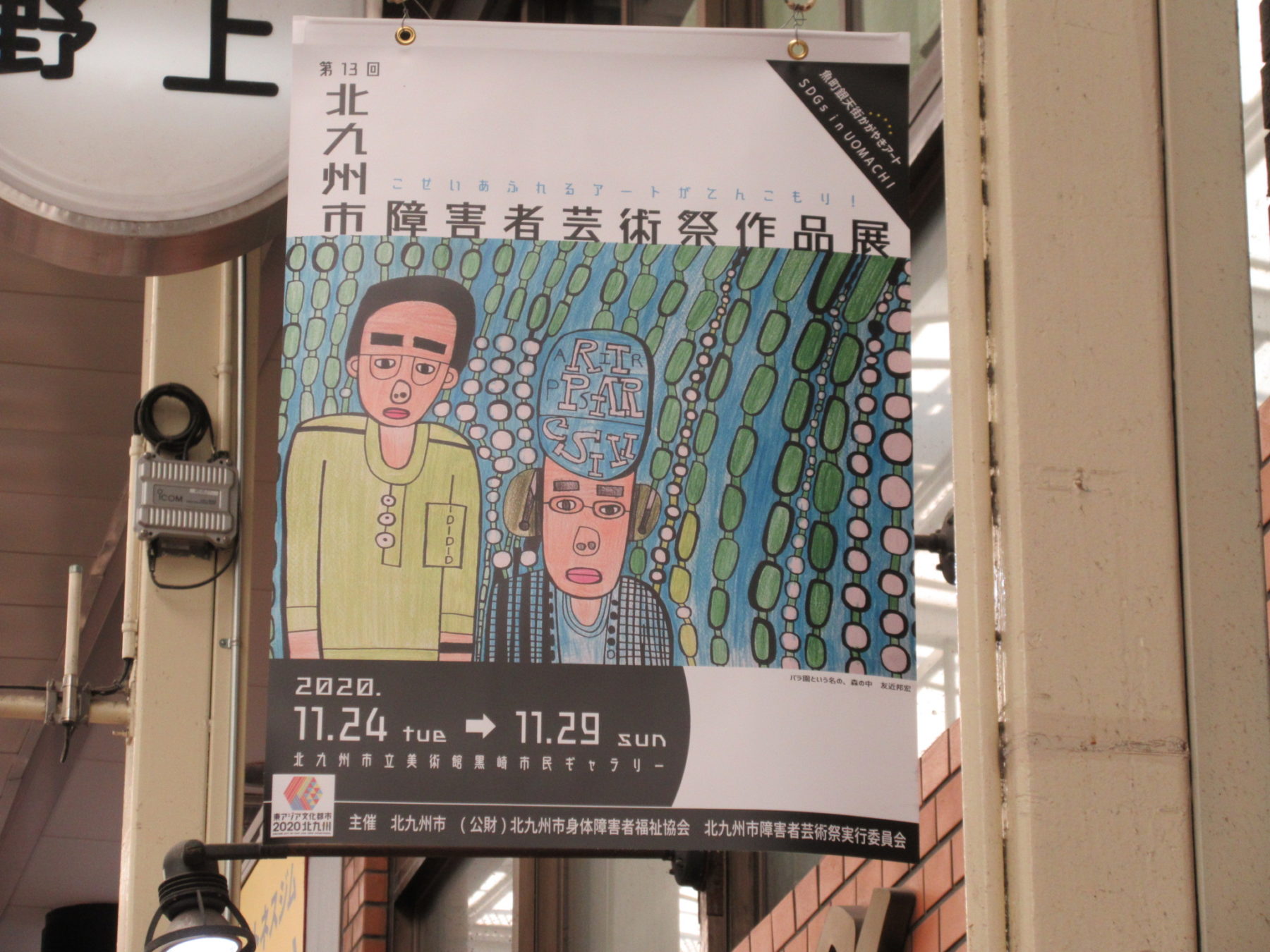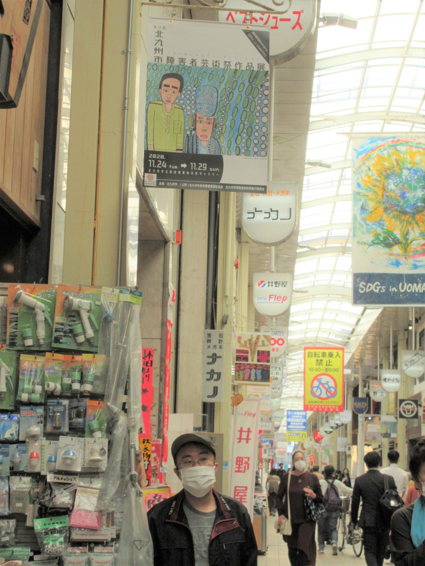 今年も第13回北九州市障害者芸術祭作品展が開催されます。そのPRの一環として「魚町銀天街かがやきアート展」が行われています。昨年の北九州市障害者芸術祭出展作品の中から、障害者アートとして鮮やかな色彩で描かれた作品、一般的な美術作品にはない観る人を圧倒するような作品を基準に15作品が選ばれ、魚町銀天街にバナーフラッグ(旗)となり並んでいます。そのうちの一つに友近さんの作品が選ばれました。