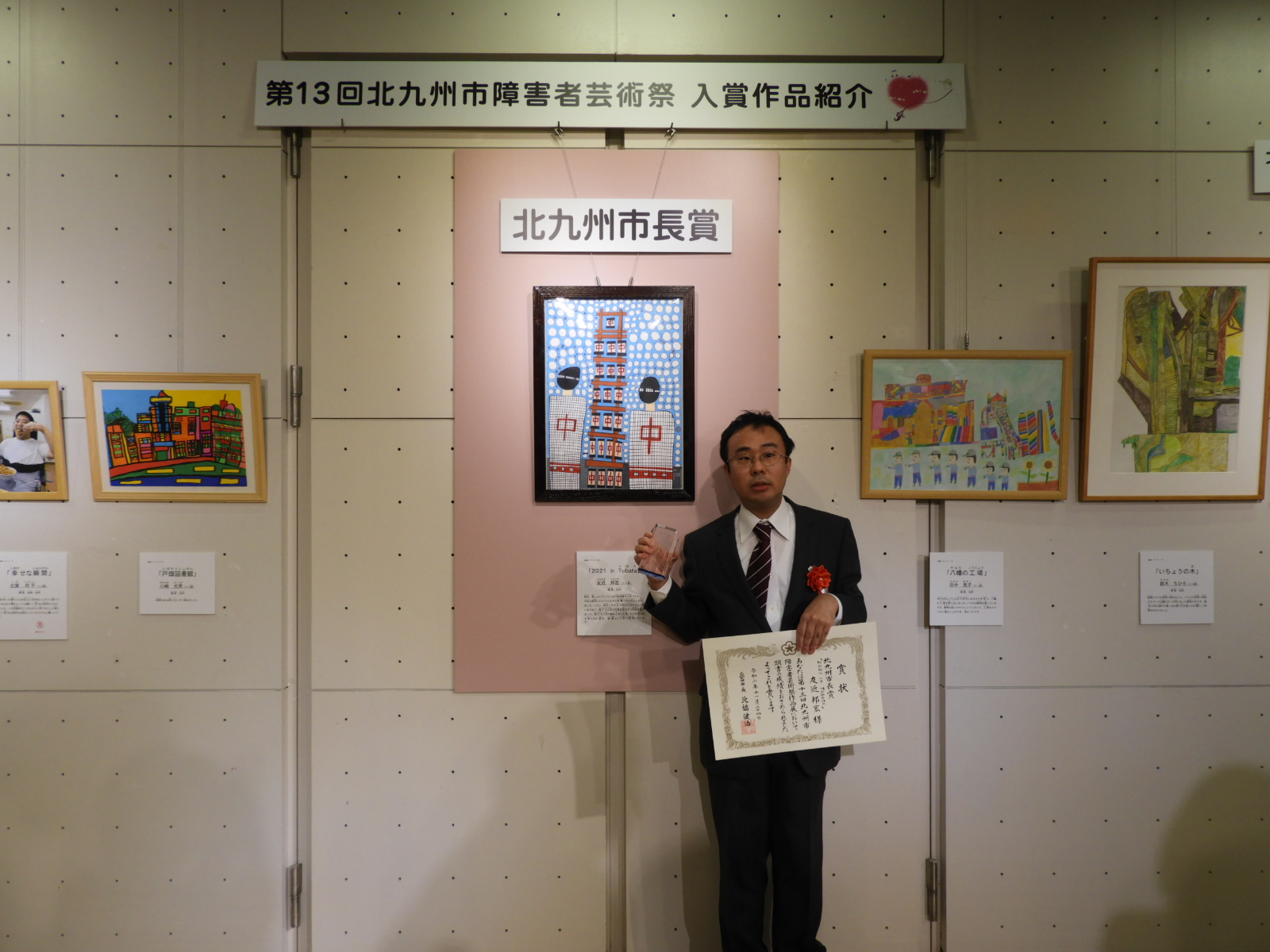 1124日に、『第13回北九州市障害者芸術祭 作品展』の表彰式が北九州市立美術館黒崎市民ギャラリーにて執り行われた。新型コロナウイルスの影響で、表彰式以前に作品展の開催が心配されたが、嬉しいことに当日は感染防止対策が十分に行われた状態で、例年通り開催されることとなった。