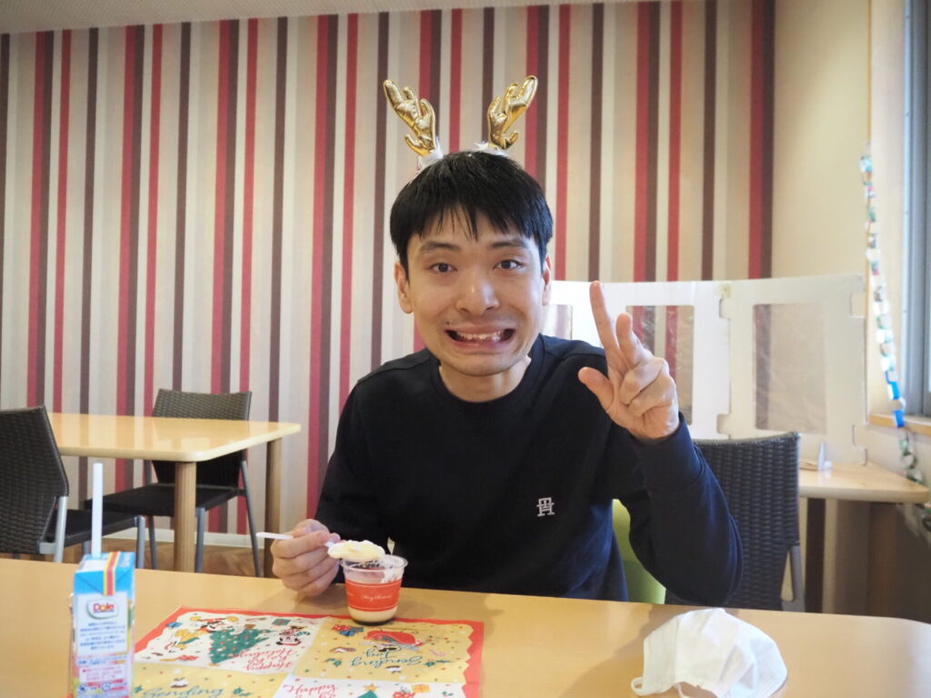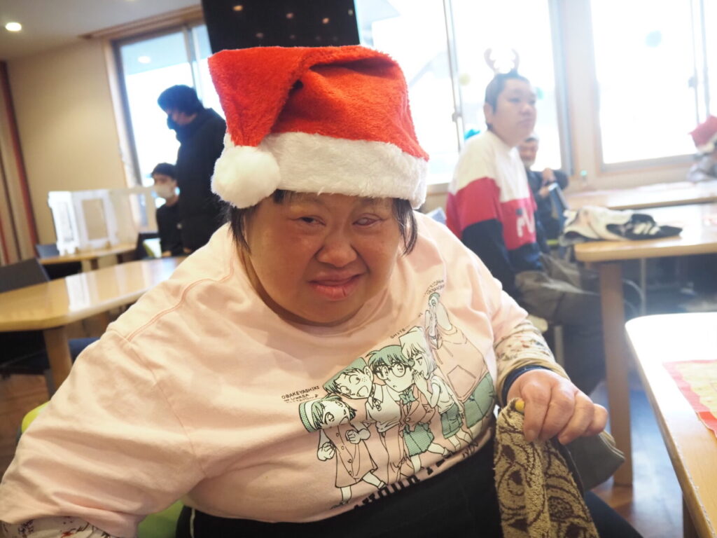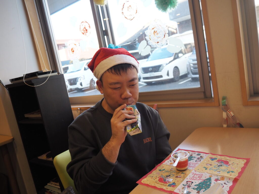 先日、生活介護では年内最後のイベントとして、毎年恒例のクリスマス会を行いました。利用者さんの皆さんはクリスマス会が楽しみで、事前準備や当日も会場の飾りつけを職員と一緒に頑張ってくれました!ありがとうございます!!クリスマス会では、各々カチューシャや帽子を着用して可愛く仮装🎅メインイベントであるサンタクロースに会う前にプリンとジュースを食べます。今年のサンタクロースは誰だろう??と皆さんワクワク✨クリスマスソングに合わせて手拍子をしたり、歌ったりと皆さんが楽しまれている姿を見ることができてうれしかったです。年内も残り少ないですが、風邪を引かないよう手洗いうがいを忘れずに最終日まで乗り切りましょう!