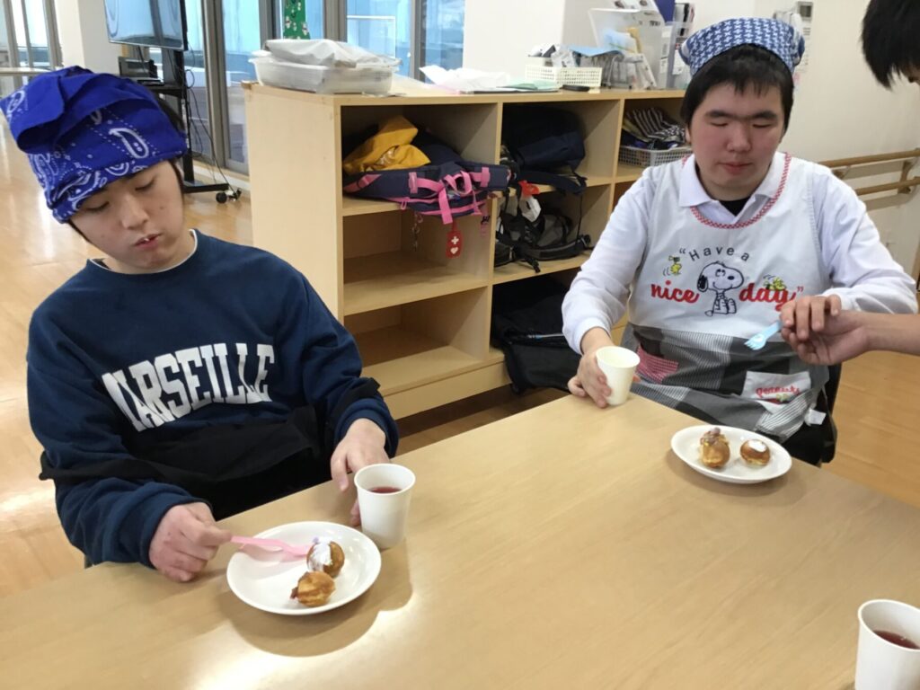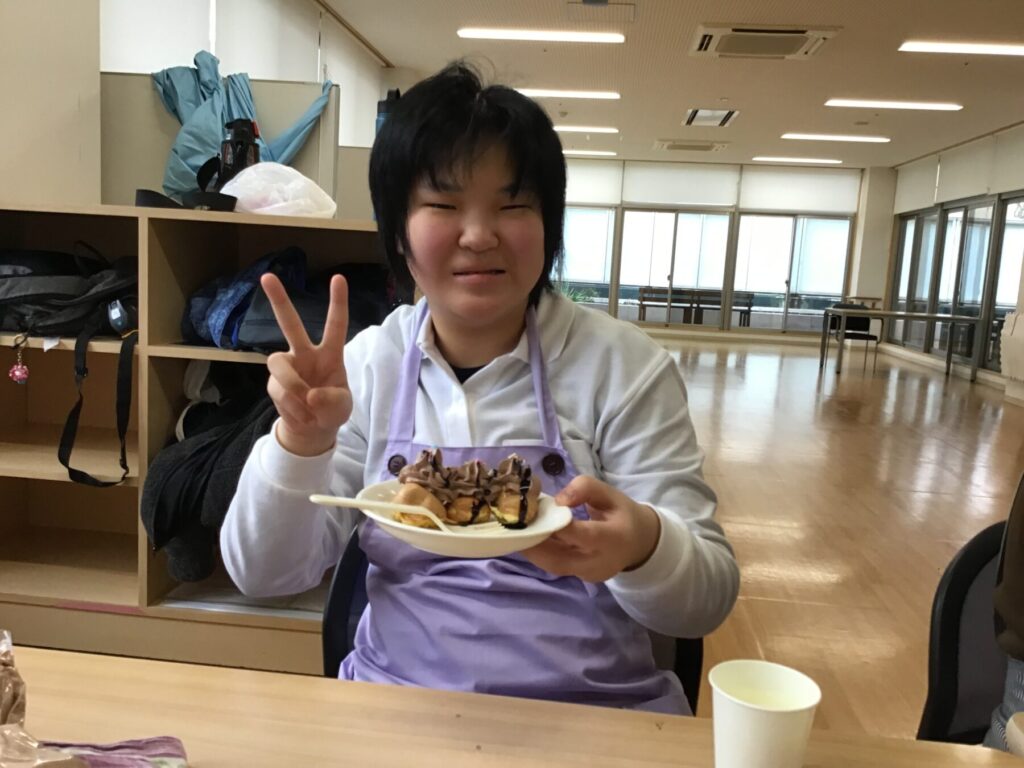 みんなで協力して焼けたベビーカステラは、生クリームやカラースプレーなどを一人ひとり好きなようにトッピングをして、笑顔が弾けていました。みんなでワイワイ言いながらベビーカステラを作りトッピングした今回のおやつ作りは、普段のおやつと違い、作る作業から笑顔で楽しそうな様子でした。