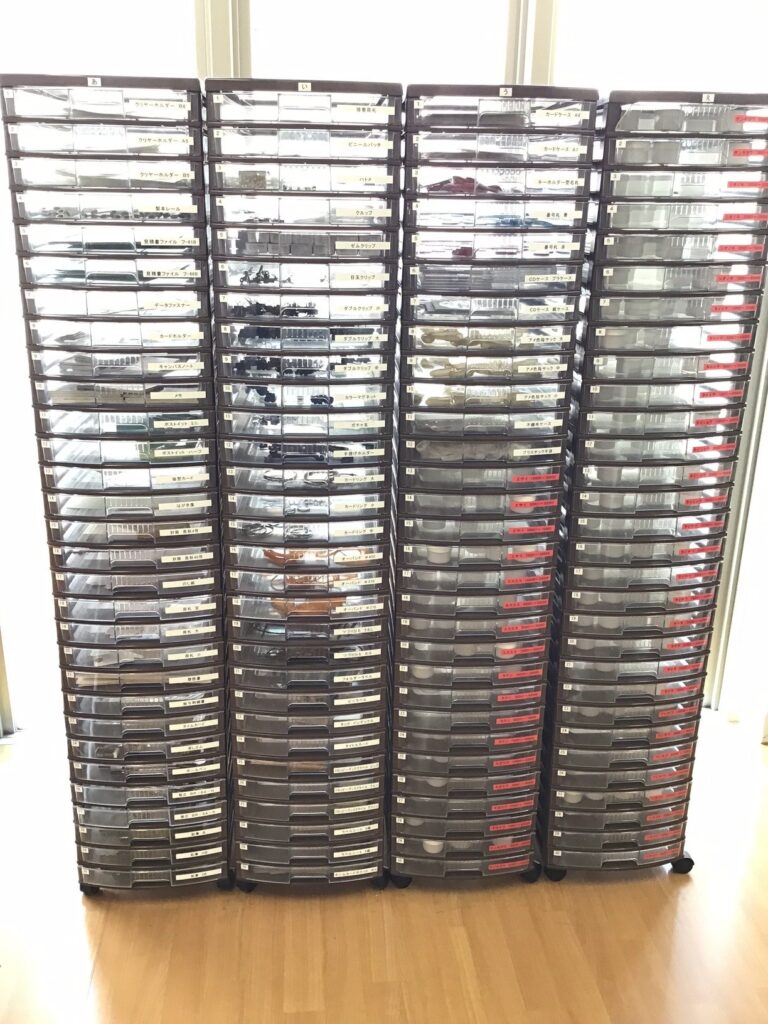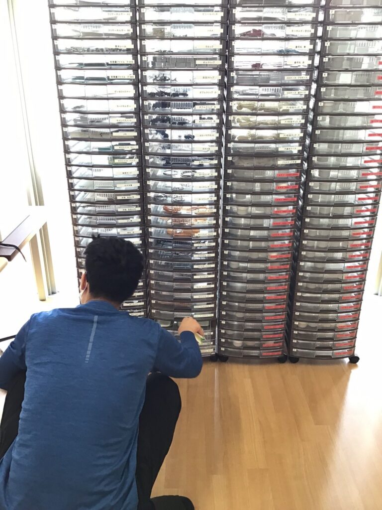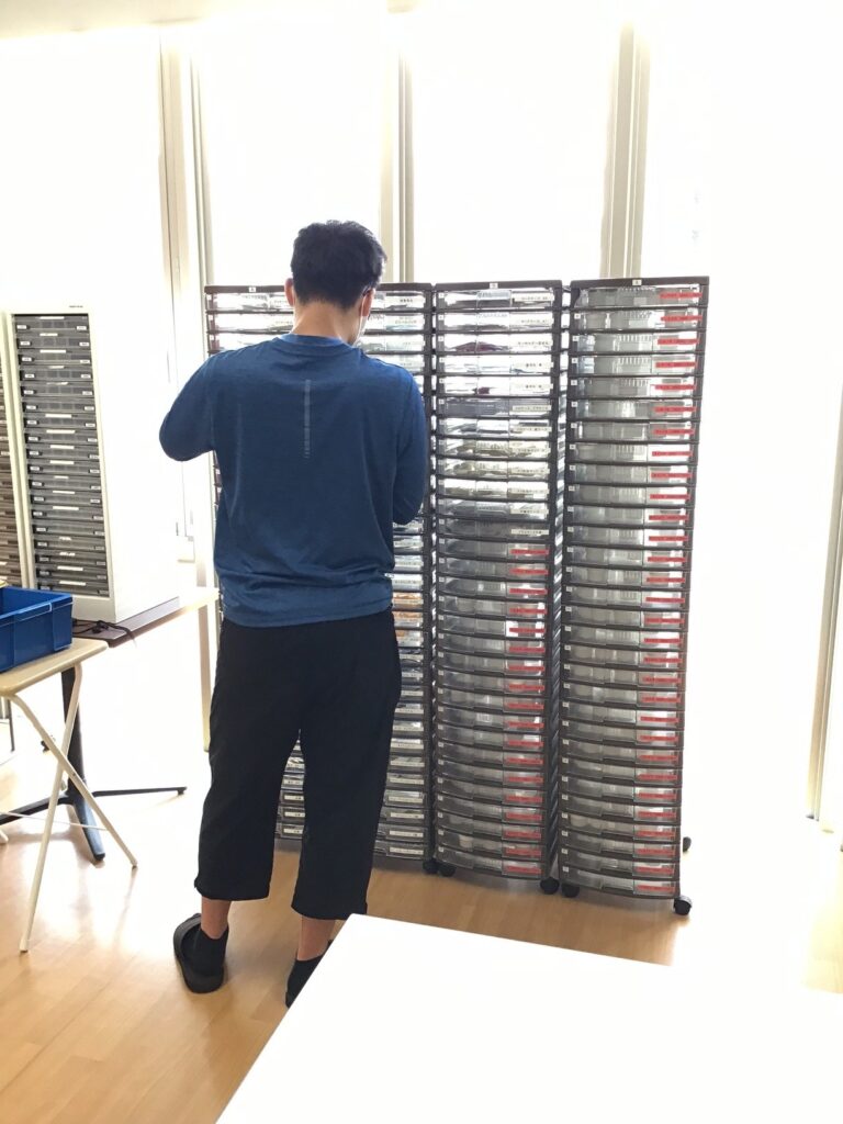 最初にタイマーで測り、ピッキング作業用のファイルを見て注文書にある品物を、必要な数通り引き出しの中から取ってコンテナの中に入れていきます。