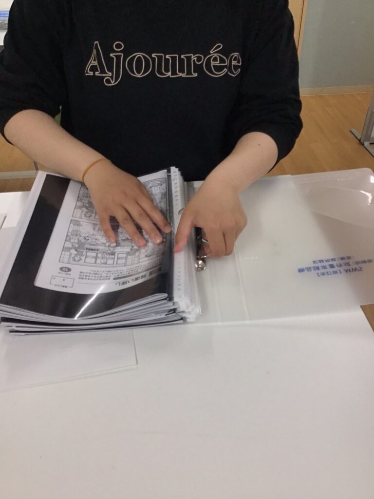 コピーが終わった後には、コピーしたA3サイズを2つ折りにしてA4のクリアポケットになおすところまでお願いをしました!