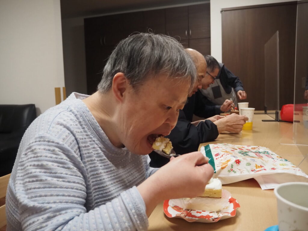 サンタクロースから受け取ったプレゼントを皆嬉しそうに眺めながら、美味しいケーキを頬張り