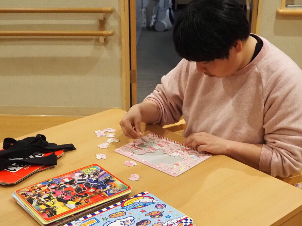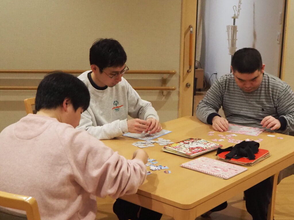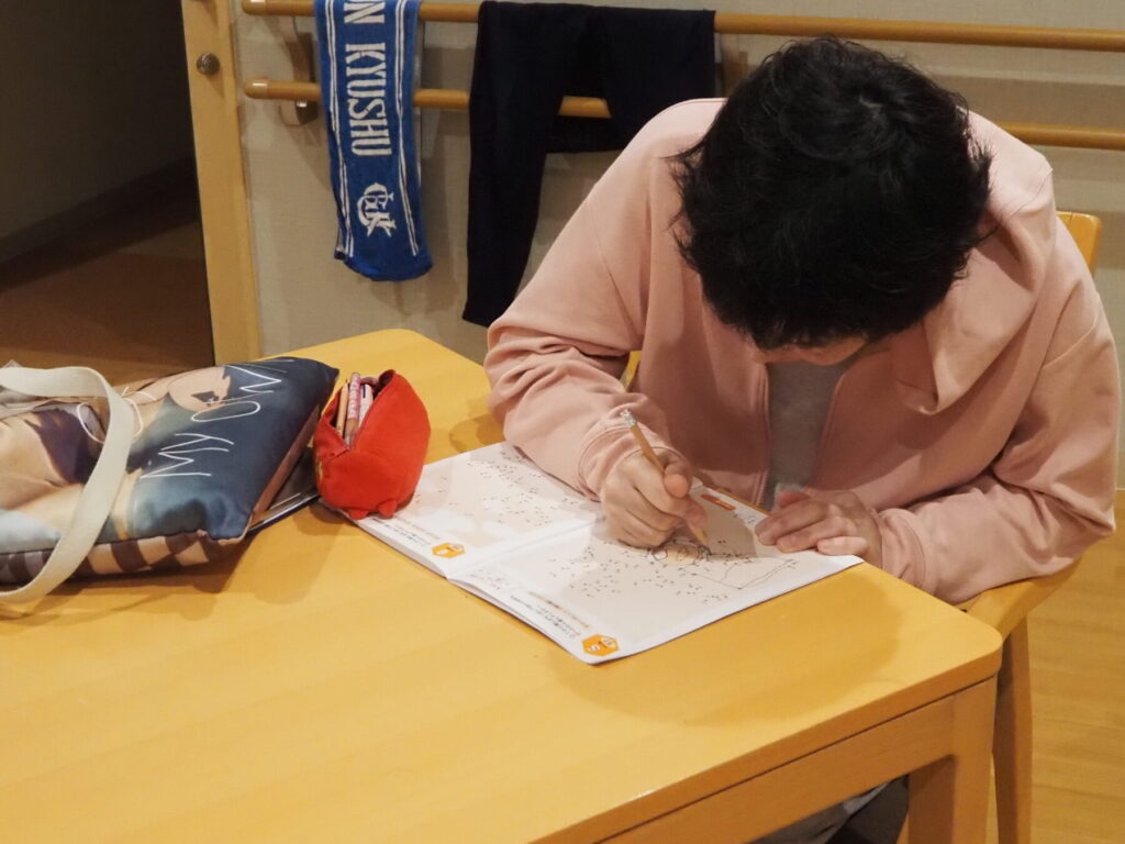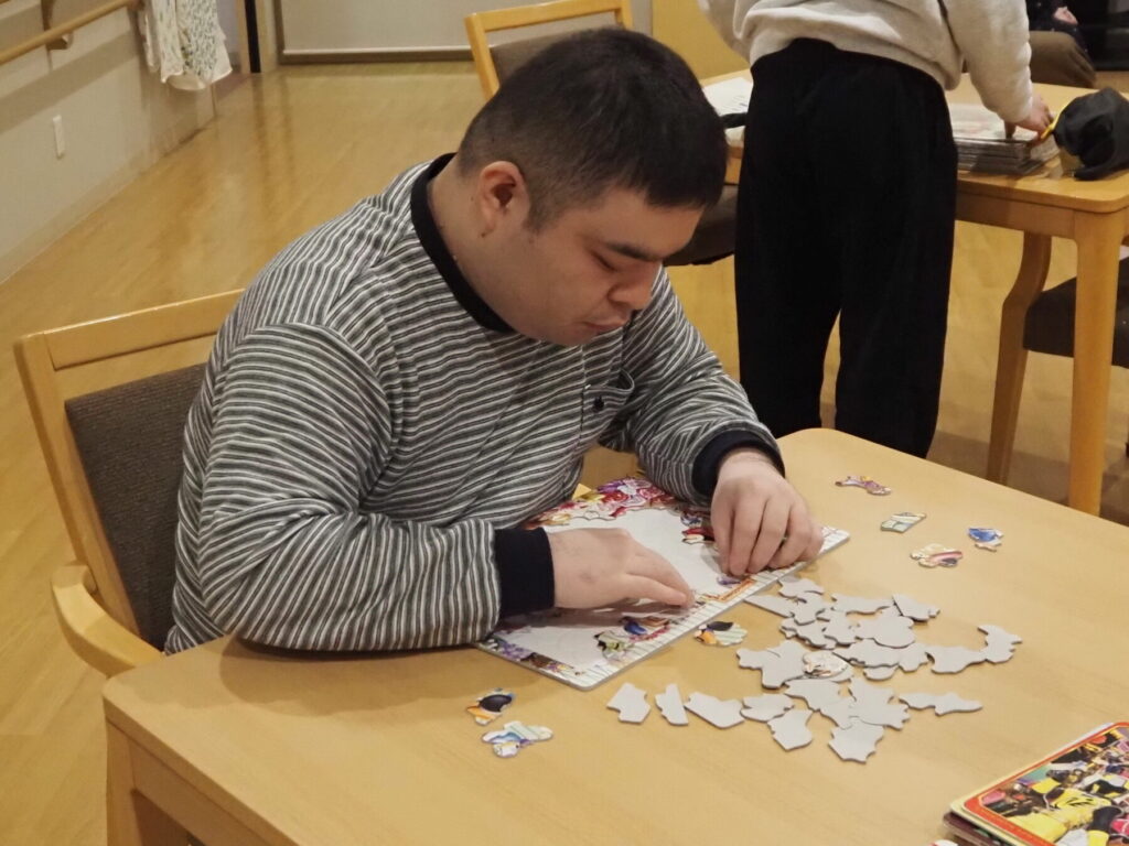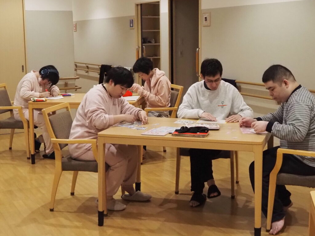 入浴や夕食を済ませた就寝までの時間。この日はなぜだかひとり、ふたり、と居室から共有フロアに出てきては、塗り絵やパズルをして過ごす様子がありました😌