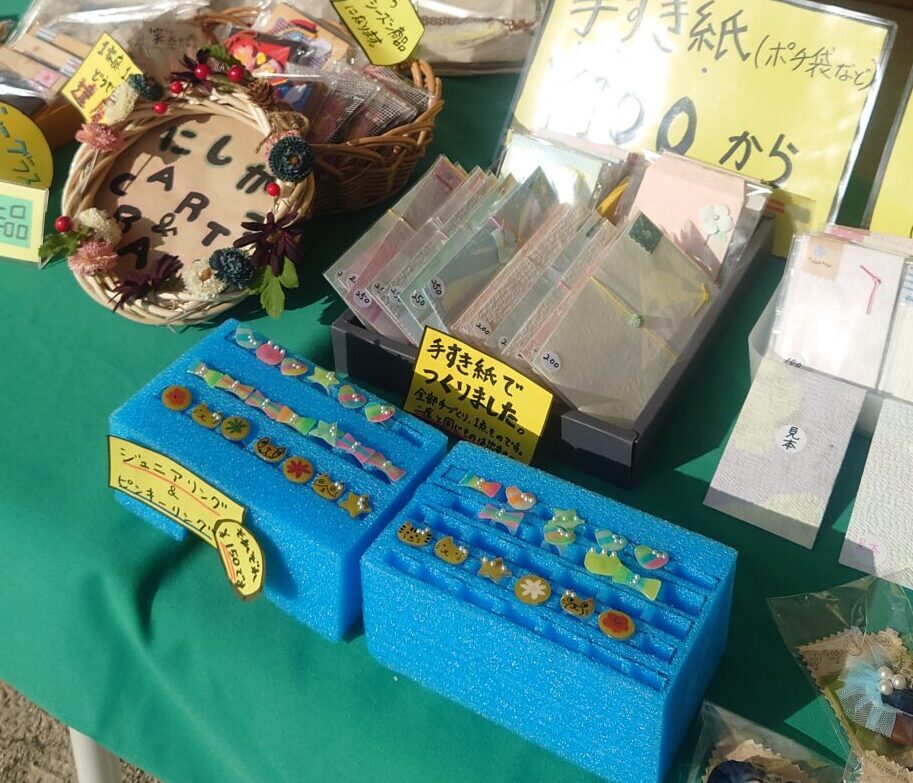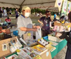 活動センターも久しぶりの出店ということで、農園で採れたてのナスやミニトマト、ピーマンなどの夏野菜と共に、生活介護の日々の活動で製作した製品を370点ほど販売しました。ひときわ人気だったのはプラバンのキッズリング!小さなお客さんたちは次々指にはめてみてお気に入りを探していました。他にもあれこれ悩みながら10点以上購入されたお客さんもいたとのこと!利用者さんが「子供たち喜んでくれるかな?」とワクワクしながらイラストを描いたりラッピングをした製品なのでとても嬉しく思いました。また来年の開催まで楽しみながらたくさんの製品を作っていけたらと思います。