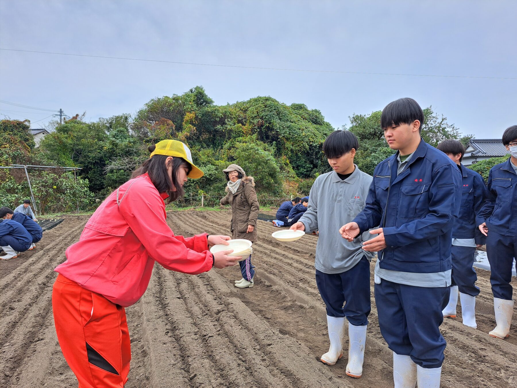 11月16日、福岡県立遠賀高等学校、農業食品科の生徒さん30名が、校外学習として利用者さんと農作業を行いました。