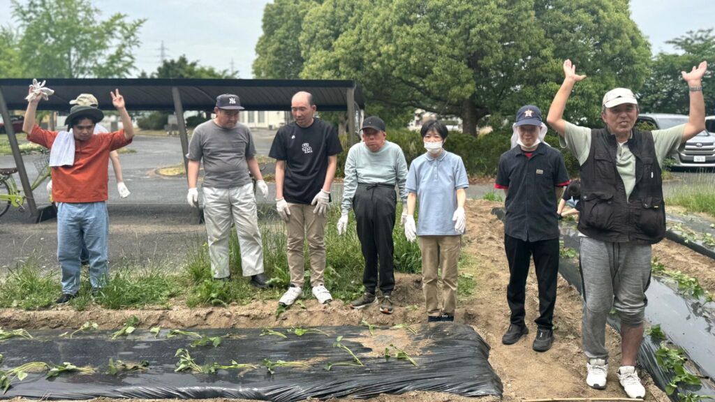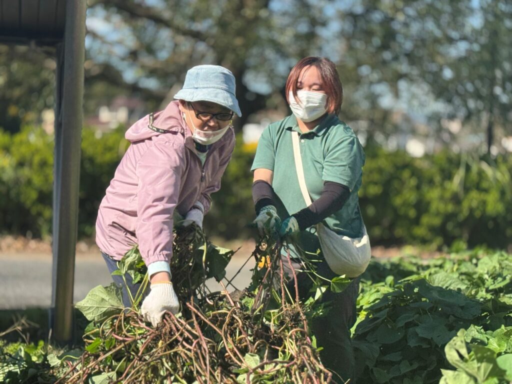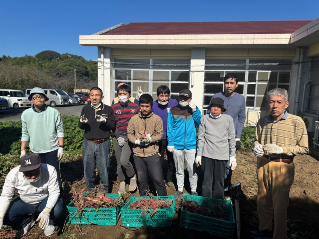 11月に入り生活介護創作の芋ほりを2日かけて行いました。5月に100本あまりの『紅はるか』の苗を植え付けてから約半年。猛暑に負けず元気に生い茂った芋づるをつる返しして収穫の時を待っていました。