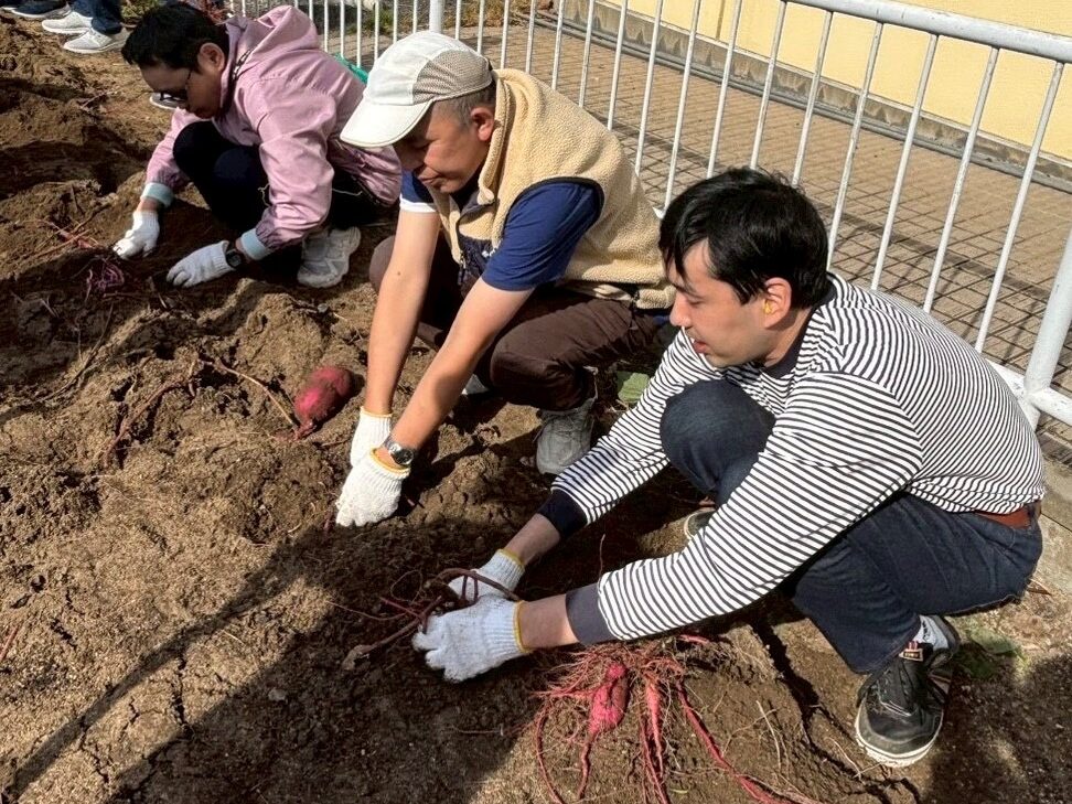 当日は芋ほり大好きなメンバーが集まり、まずは全員で重たいつるを綱引きの要領で片付けました。土から赤い芋が顔を覗かせると、我先にと手を伸ばしたり、傷つけないようにそっと周りから掘り起こしたり、泥だらけになりながらも楽しまれていました。